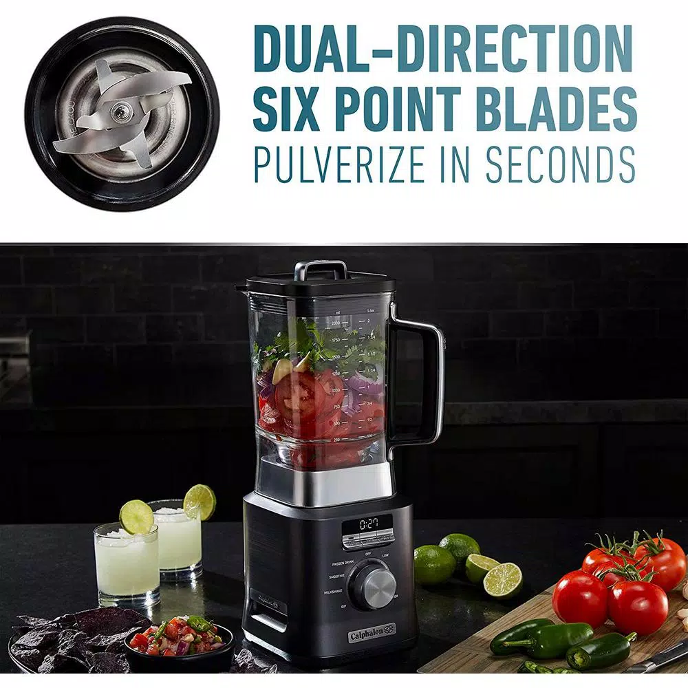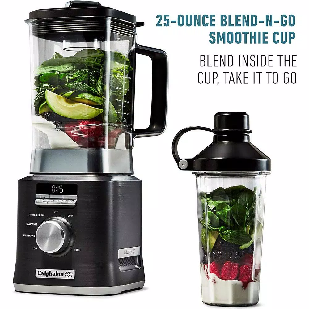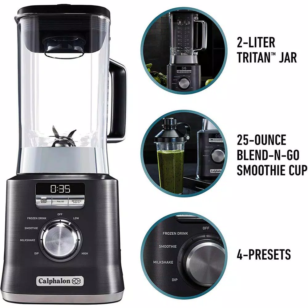 No more pulsing, shaking the jar, or hand stirring needed for excellent results with the Calphalon Auto-Speed Blender. It senses the mixture in the jar and automatically adjusts power to maintain blade speed and deliver perfectly blended results, regardless of the recipe. Dual-direction blades and the powerful 1,100-watt motor perfectly pulverize the contents and the reverse pulse function is great for tough ingredients. The 2-liter Tritan jar is dishwasher safe and BPA-free. An All-Metal Drive delivers long-lasting durability and a digital interface with countdown timer provides intuitive control. If youre on the run, the included Blend-N-Go smoothie cup lets you add ingredients and blend inside the 25 oz. cup, then take it with you for fast, portable convenience.