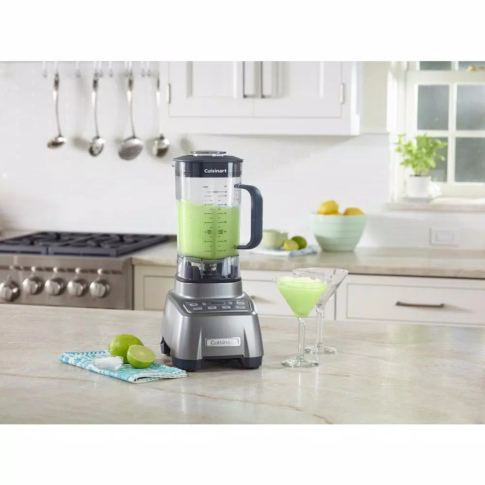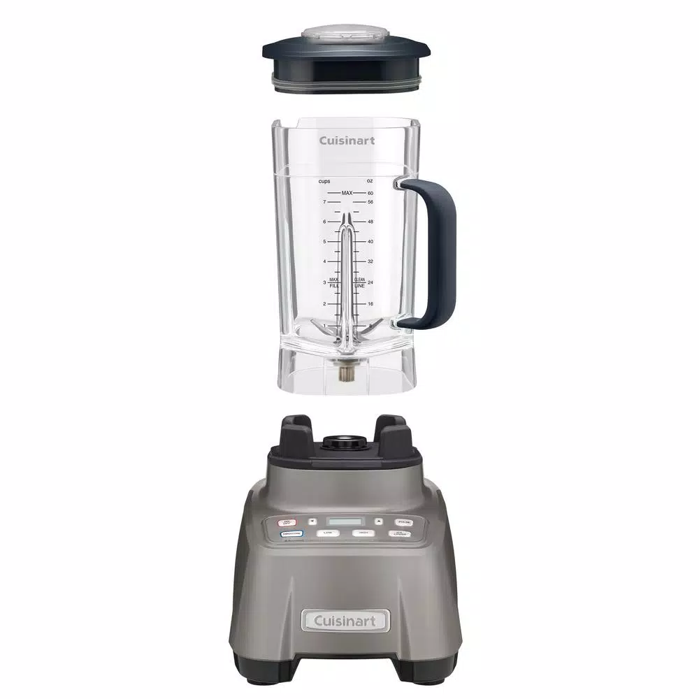 This Cuisinart Hurricane blender is revved and ready to go. The professional power 2.25 peak HP motor handles even heavy pulverizing tasks with ease, and the double housing design keeps operation quiet. The 60 oz. BPA-free Tritan jar sits in a heavy-duty plastic base and is uniquely designed for easy pouring, with a soft-touch handle for a secure grip. This blender operates at the touch of a button, with Low and High speeds, Pulse and pre-programmed Smoothie and Ice Crush options.