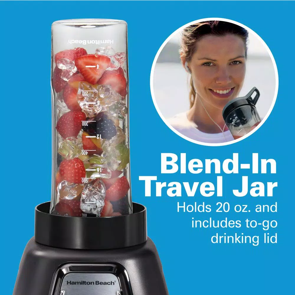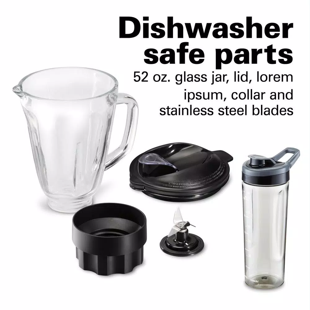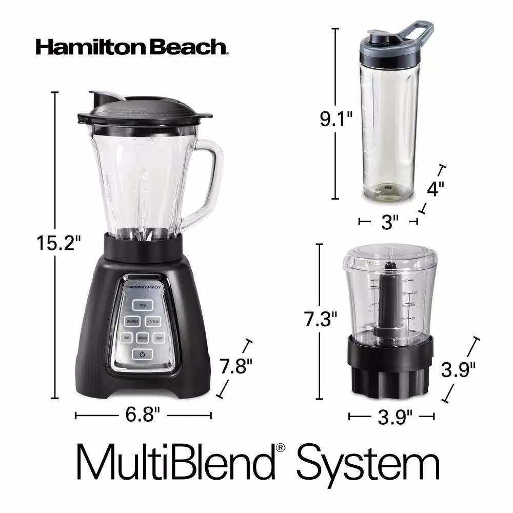 If you love to cook but are short on space, the Hamilton Beach MultiBlend System can give you the flexibility you need to blend, puree, dice, chop, grind and crush ice with just one appliance. Use the 52 oz. glass blending jar for making a batch of milkshakes for the family or pureeing a fresh sauce to top your meal. Or, swap the jar for the 3 cup food chopper attachment to dice vegetables or mince garlic for a stir fry. The travel jar lets you blend in the jar and go because it has a to-go drinking lid. One-touch Smoothie and Ice Crush settings are pre-programmed to run for the optimal amount of time for each job, offering walkaway convenience. Its 950 watt peak-power motor offers the power you need to handle even the trickiest ingredients, like raw vegetables or large pieces of frozen fruit. When it’s time to clean up, the jars, lids and stainless steel blades are all dishwasher safe.