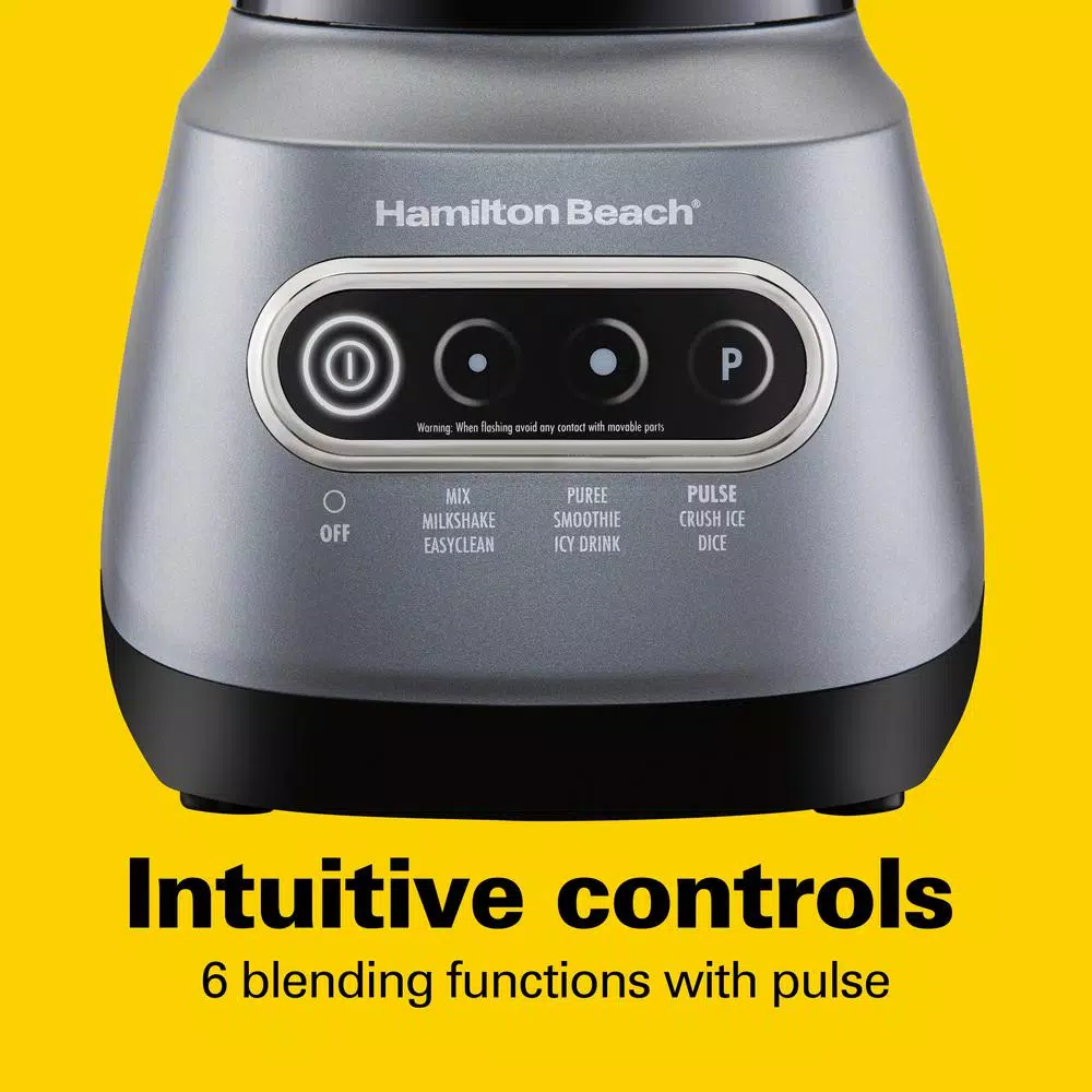 If you need the versatility of a large blender but love the flexibility to blend and run, the Hamilton Beach Wave Crusher Blender is the perfect solution. The base fits both the 40 oz. blending pitcher and an included 20 oz. blending jar that you can take on the go. Now its easy to make a smoothie or milkshake for one, or the entire family. The 800 watt peak power motor and ice-crushing stainless steel blades produce ultra-smooth fruit smoothies, shakes and icy drinks. 6 blending functions plus pulse and intuitive controls make it easy to achieve the consistency you want. Other thoughtful innovations include a unique spout that pours without messy drips and a patent-pending design that reduces noise from the motor. When it’s time for cleanup, the blades and jars are removable and dishwasher safe.