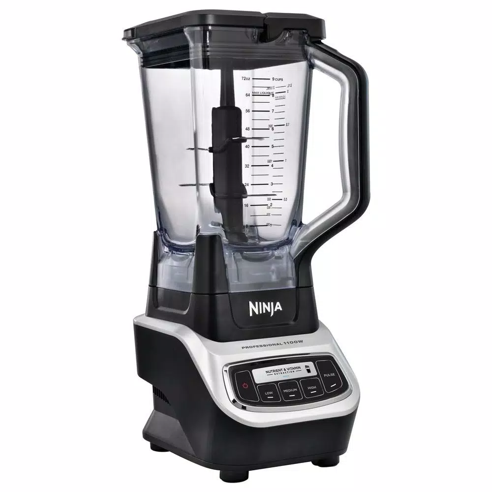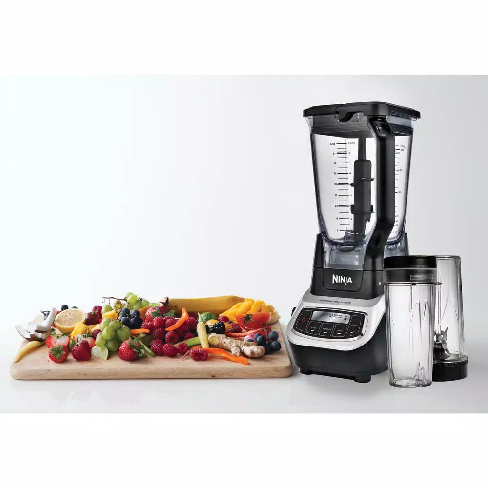 The Ninja Professional Blender and Nutri Ninja Cups has 1100-Watts of professional power and performance. Total Crushing Technology crushes through ice and frozen ingredients in seconds to create creamy frozen drinks. Use the 72 oz. Pitcher for large batches of delicious margaritas and daiquiris. The Nutri Ninja Blade Assembly pulverizes whole fruits and vegetables for Nutrient and Vitamin Extraction. Blend personalized smoothies and juices directly in the 16 oz. Nutri Ninja Cup, attach the lid, and enjoy on the go. 64 oz. max liquid capacity Extract a drink containing vitamins and nutrients from whole fruits and vegetables.