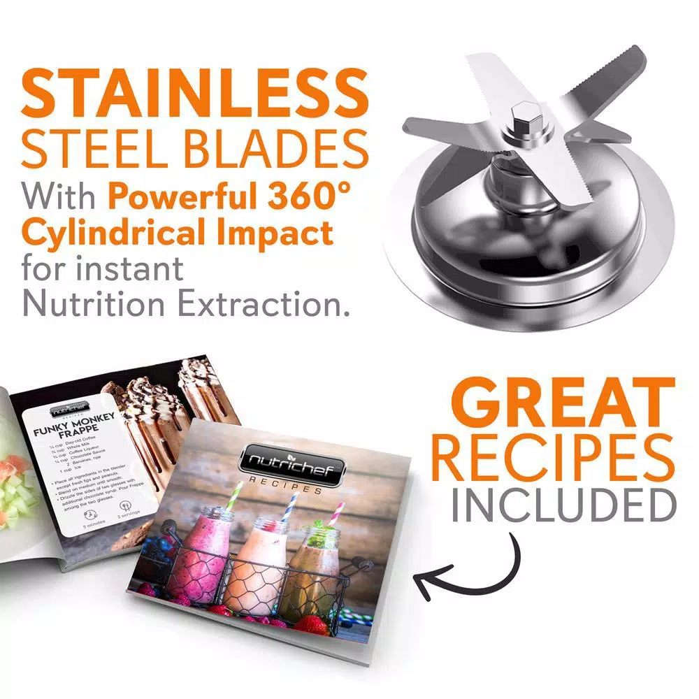NutriChef was created on the principle that healthy home cooking should be attainable to all, regardless of skill level and economic status. Starting in 2014, we noticed the disconnect in our lives and in the lives of those around us. We were so busy, always rushing forward and our health and personal lives suffered. We needed to find some way to slow down and put our health first, all without sacrificing convenience or taste. Could we somehow create healthier versions of our favorite foods, easily in our own kitchens. The answer was a resounding yes and NutriChef was born. What’s in the Box: Electric Blender Base Blend Container with Lid and Blade, Food Recipe Book Removable Lid Cap and Plunger Technical Specs: High-Powered Blender Motor: 1700-Watt Blend Speed Settings: Up to 30,000 plus RPM Adjustable Speed Control: 5 Speed Settings: Adjustable Blend Time Setting: up to 10-Minutes, Blender Container Capacity: 1.7 l (57 oz.), Noise Operating Level: 90 dB Construction Material: Clear Tritan Blend Container, Engineered ABS Housing, Power Cable Length: 3 ft., Power Supply: 120-Volt Total Blender Size: 7.8 in. x 7.9 in. x 19.28 in.