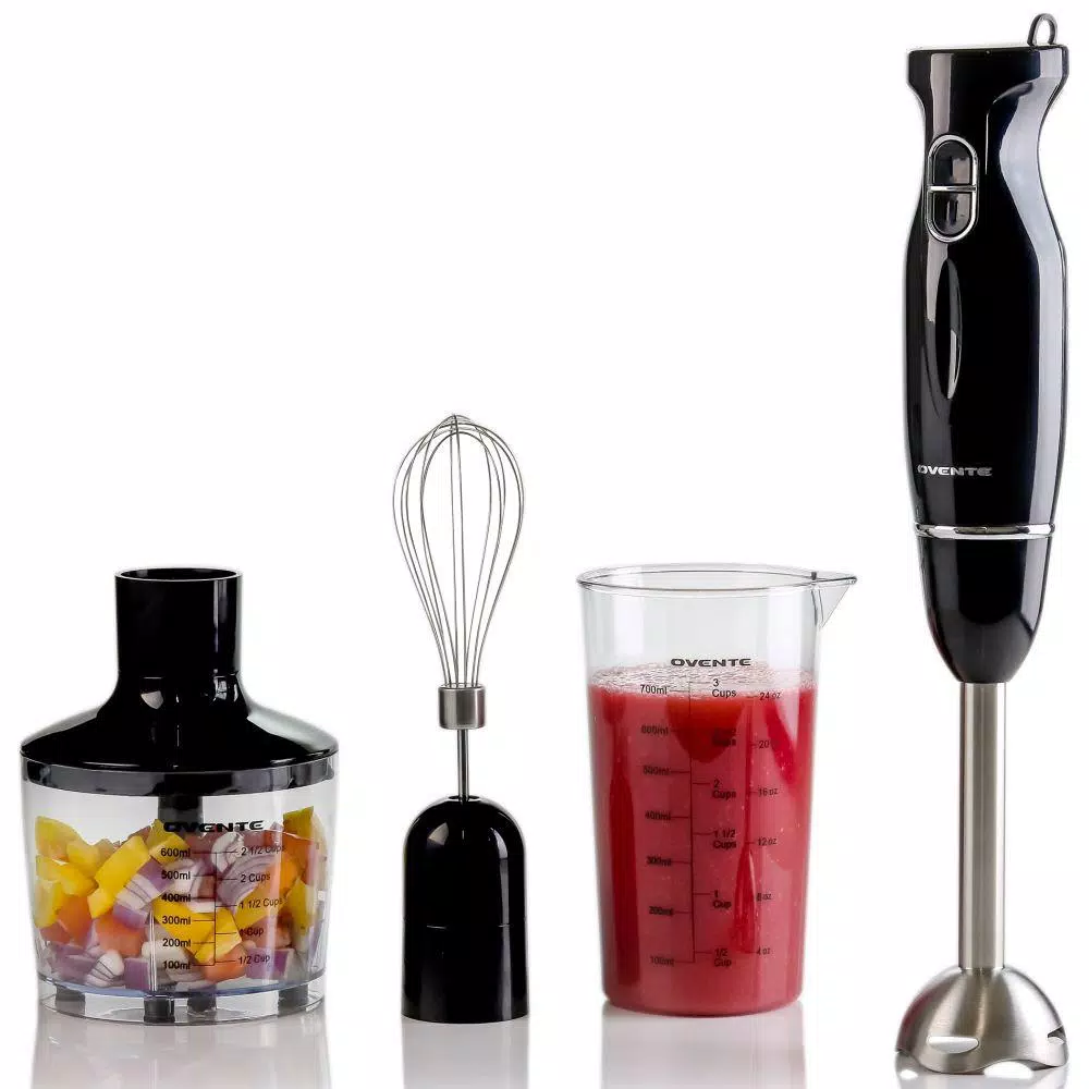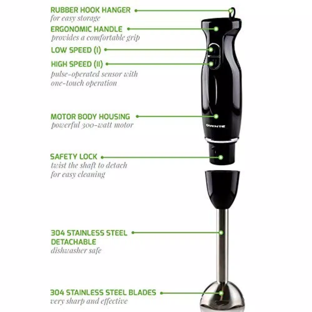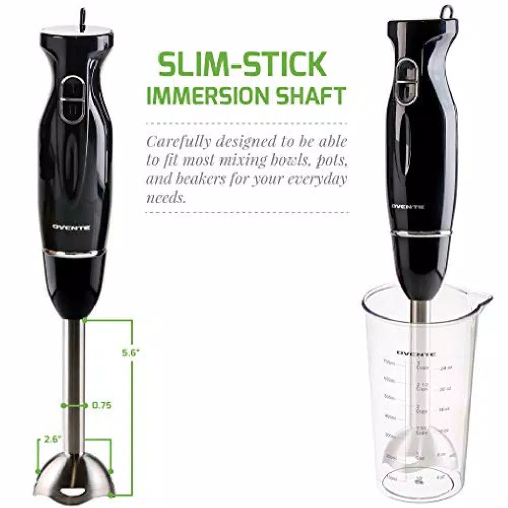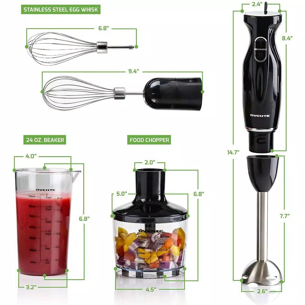Discover a world of innovative cooking possibilities with the Ovente HS565 Multi-Purpose Immersion Blender. Its a pleasure to blend and mix food with this hand blender because using this appliance is fun and effortless. Its lightweight body along with its ergonomically-designed non-slip handle is comfortable to hold and control, thats why cooking wont ever feel like a chore again. Whip up all of your favorite gourmet soups, guacamole, smoothies/shakes, cake batter, salsas, sauces, marinades, salad dressings, or even homemade baby food for your precious bundle of joy with just one press of a button. Its Slim-Stick design enables this hand blender to fit into any mixing bowl, pot, beaker, or cookware without restriction. Its compact enough to fit anywhere, but powerful enough for the toughest blending jobs. It was also carefully designed to come apart easily so that clean up and storage are not a problem. The hand blender also comes with 3 premium attachments 24 oz. beaker that can be used for measuring liquid, a food chopper that can be attached to the motor housing for chopping ingredients, and a stainless steel egg whisk for whisking cream, egg whites, and other treats. NOTE: TO PREVENT OVERHEATING, OPERATE THE HAND BLENDER IN ONE MINUTE INTERVALS OR LESS.