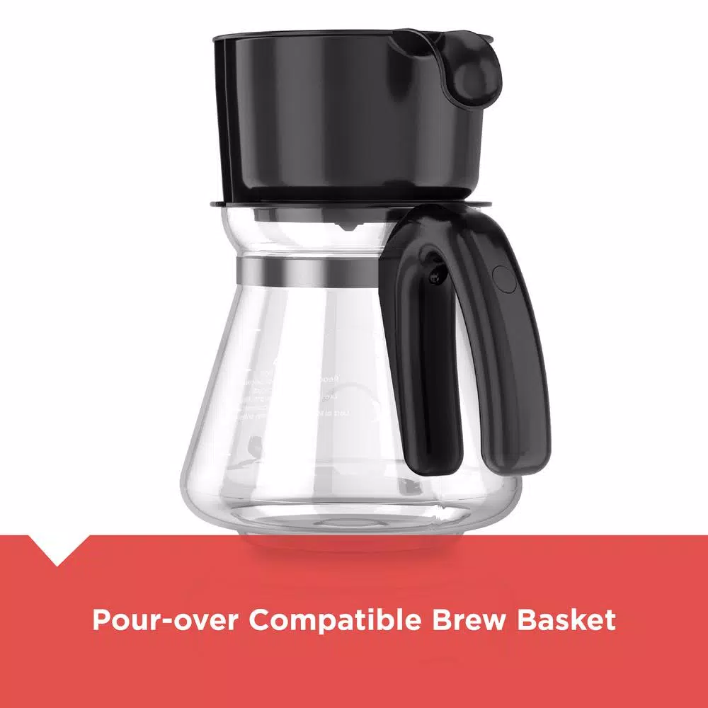 - Pour Over-Compatible Brew Basket- Remove the brew basket to create a delicious pour over that fits your tastes. This method allows you more control over the amount of coffee you use and the rate of brewing.