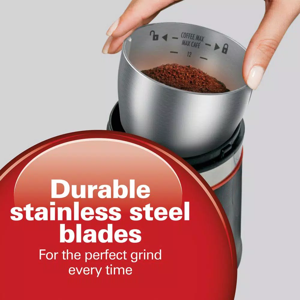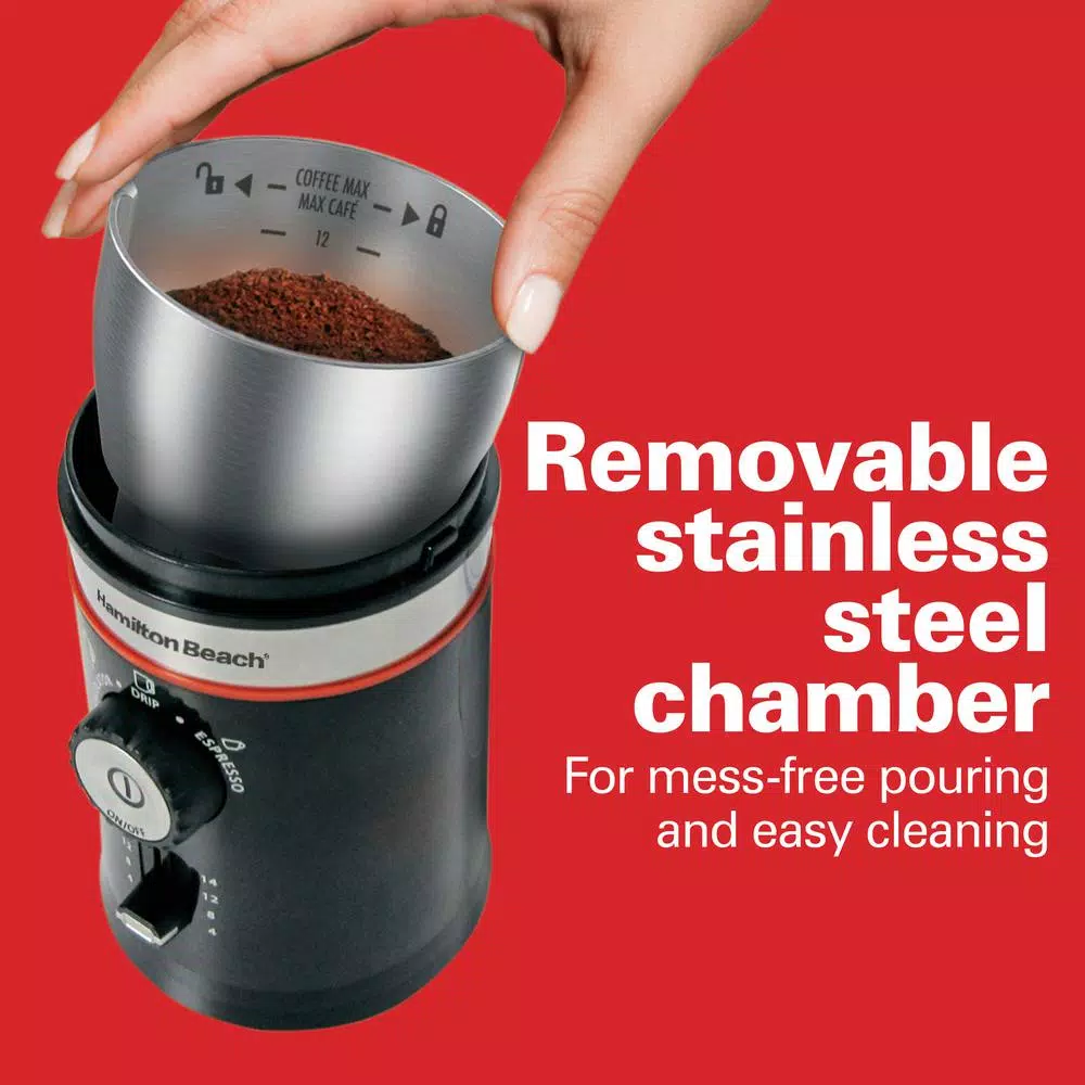 YOUR PERFECT GRIND EVERY TIME: Multiple grind settings let you customize your coffee preciselyHANDS-FREE GRINDING: Just press the button once; when grinding is complete, the grinder shuts off automaticallyREMOVABLE GRINDING CHAMBER: The stainless steel grinding chamber removes for easy filling of whole beans or spices. Once finished, remove the chamber for mess-free pouring and easy cleaning.MAKE UP TO 14 CUPS OF COFFEE: You can grind up to 10 tablespoons of beans, enough for 14 cups of coffee.STAINLESS STEEL BLADES: Durable stainless steel blades grind coffee beans and spices with ease.
