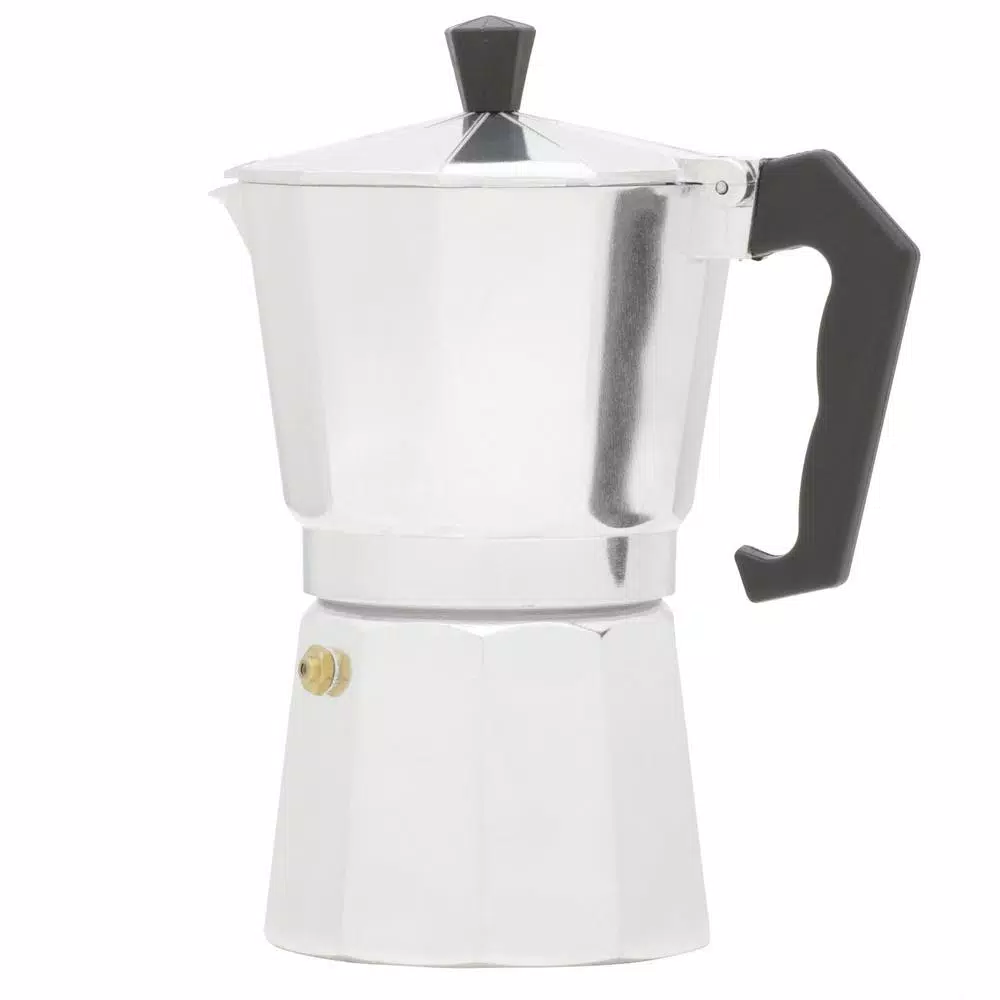 With this 6-Cup Espresso Maker you can quickly and easily prepare your favorite morning brew. It is made of polished aluminum that conducts heat very well so your drink comes out at the ideal temperature. This stove top espresso maker also features a safety pressure release valve and heat-resistant handle.