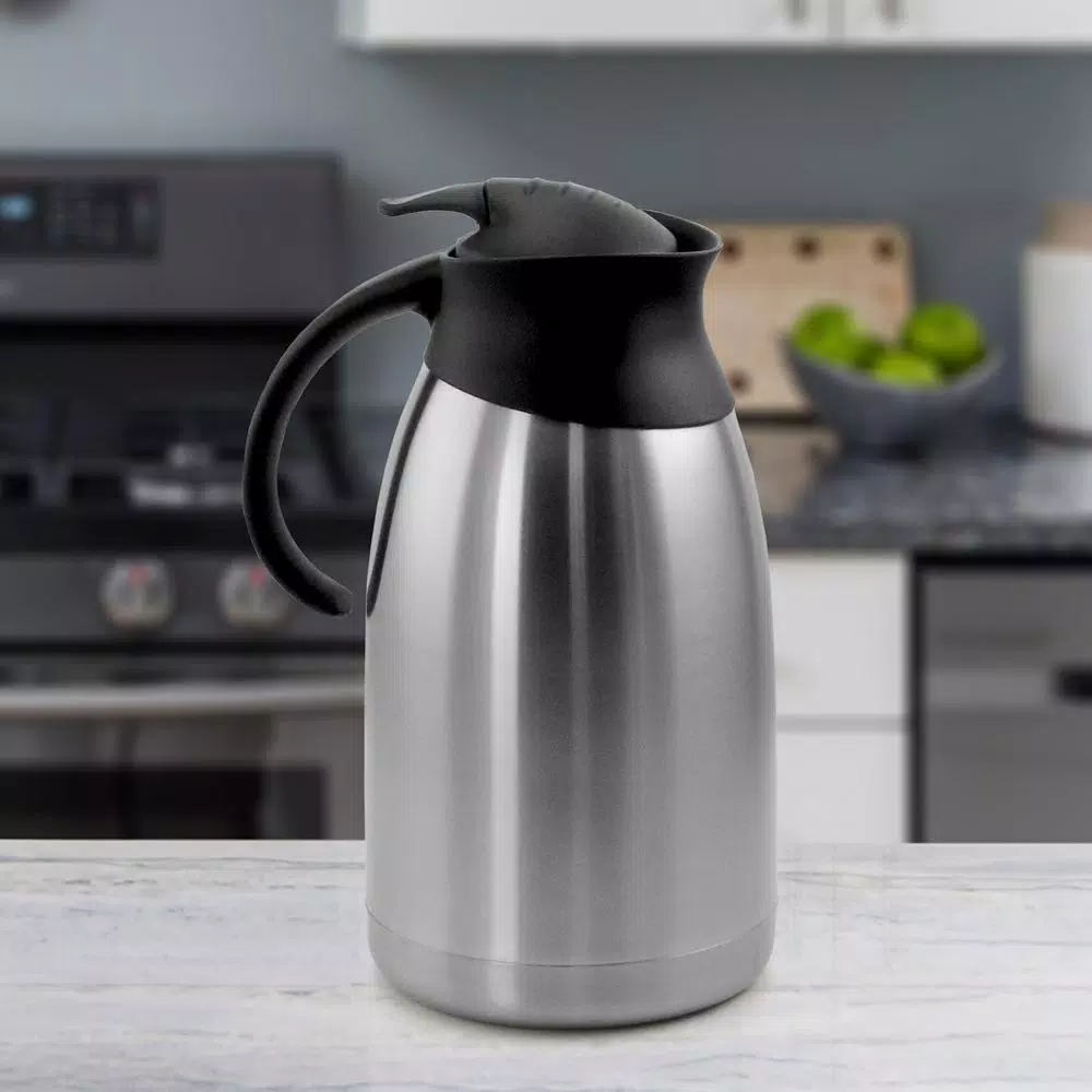 Keep your drinks hot with MegaChef 2L Stainless Steel Thermal Beverage Carafe for Coffee and Tea. This versatile and convenient hot beverage carafe is a great tool to have on hand for all gatherings and events. This thermos is equipped with stainless steel insulation, ensuring beverages stay at their desired temperature for hours. The thermos is also equipped with an easy to pour dispenser that can securely be opened and closed using the single touch safety latch attached to the lid, securing the hot liquids and minimizing spills. Thermos’ screw off top can be opened with ease and stays on securely. The thermos also comes with a 5 in. non-burn handle attached for easy transportation.