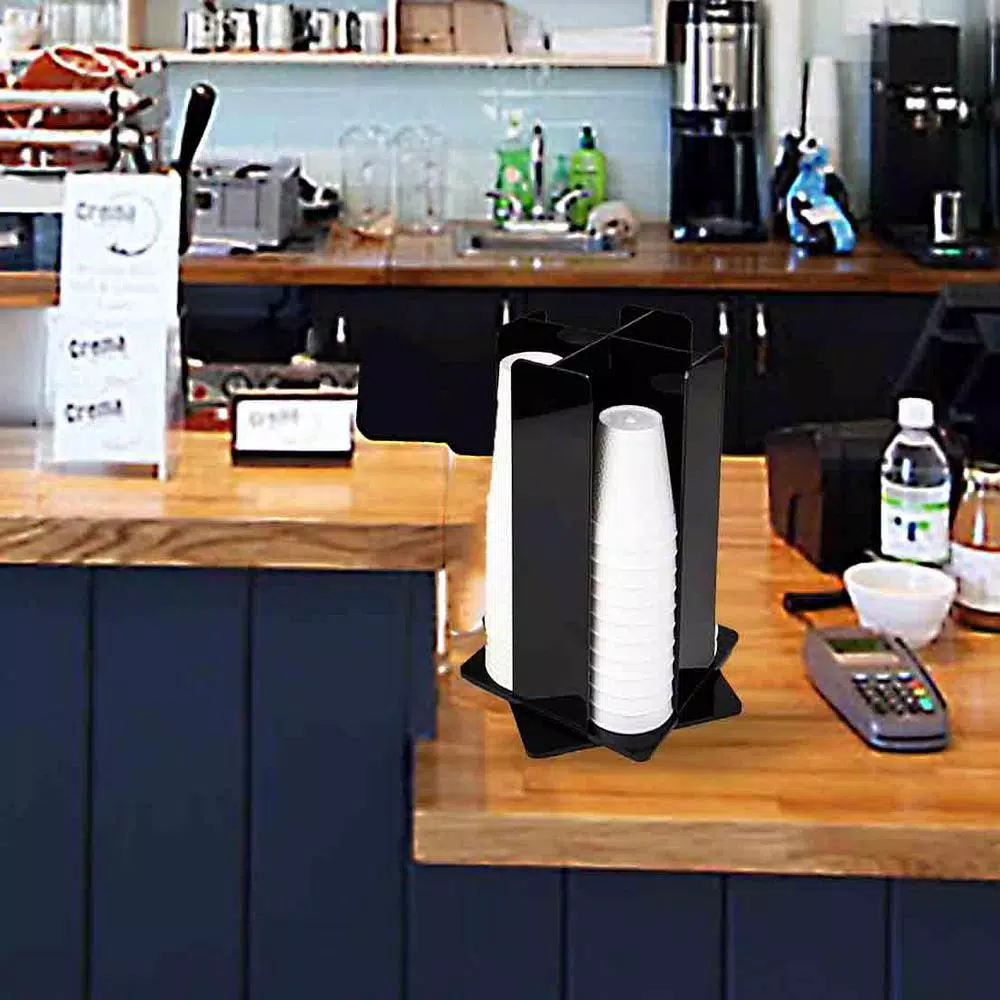 Bring a flawless appeal to your dining space by using this Mind Reader 4-Black Acrylic Rotating Cup Dispenser and Lid Dispenser. All parts are dishwasher safe.