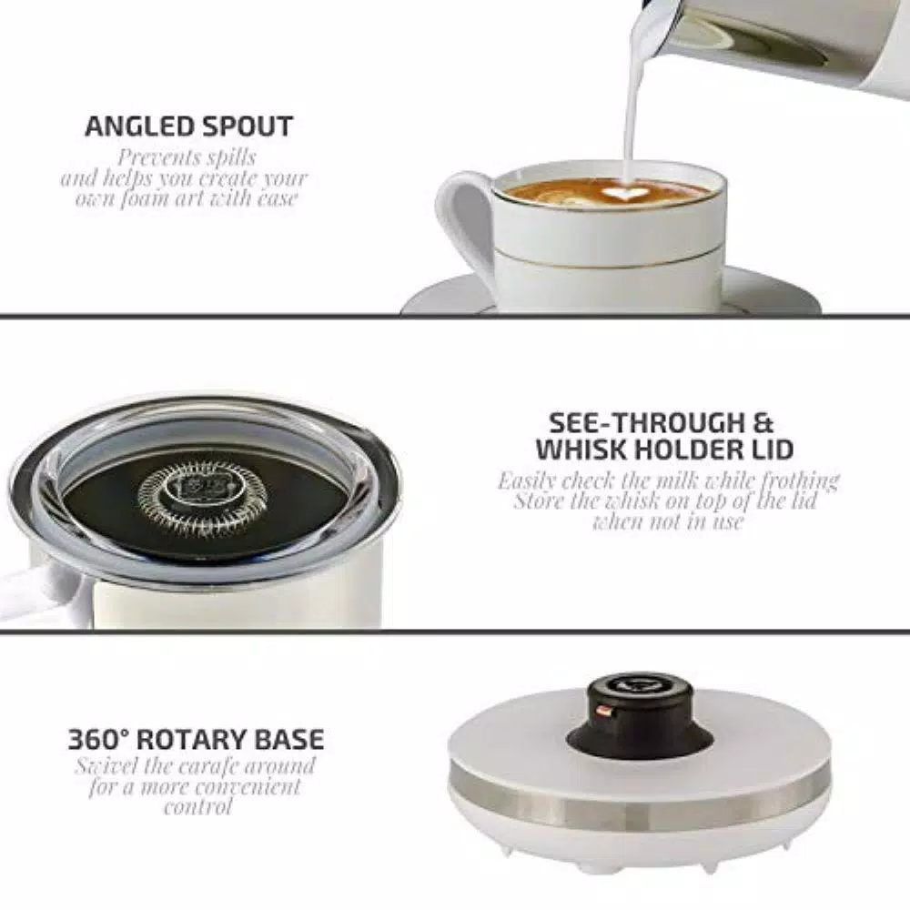 Give your drinks a silky, sweet touch to baristas and Coffee connoisseurs, no cappuccino or latte is complete with just the double Espresso and hot milk alone. Their taste budswhich are relatively hard to pleaselook for the light, foamy milk on top. Most of us think that that layer of silky froth is just for aesthetics, but that blanket of froth is more than just a canvas for Latte art. It plays a vital role in every Coffee experience, and without it, We couldn’t enjoy that velvety mouth feel and overall rich flavor of beverages. If you create your cups of joe and hot cocoas at home, make sure you don’t miss the element that winds up every morning coffee pick-me-ups and late-night hot chocolates with the Ovente electric milk frother FR1208 series. Key features – two whisks: The milk frothing machine can do more than just froth milk. It comes with two useful whisks: one for frothing and one for heating capacity: The carafe can hold 4 oz (115 ml) of milk for frothing and 8 oz (240 ml) for heating. Easy to clean: to clean the whisks, remove them first from the carafe and wash with warm, soapy water. To clean the carafe, simply flush It with warm, soapy water too. Dry them with a cloth and keep the cord coiled in the United integrated cord storage. See-through lid: The frother is made with a durable see-through lid so you can see the milk froth at one glance. 360 rotary base: It has a 360 rotary base so you can swivel The carafe around. It also doubles as a cord storage.