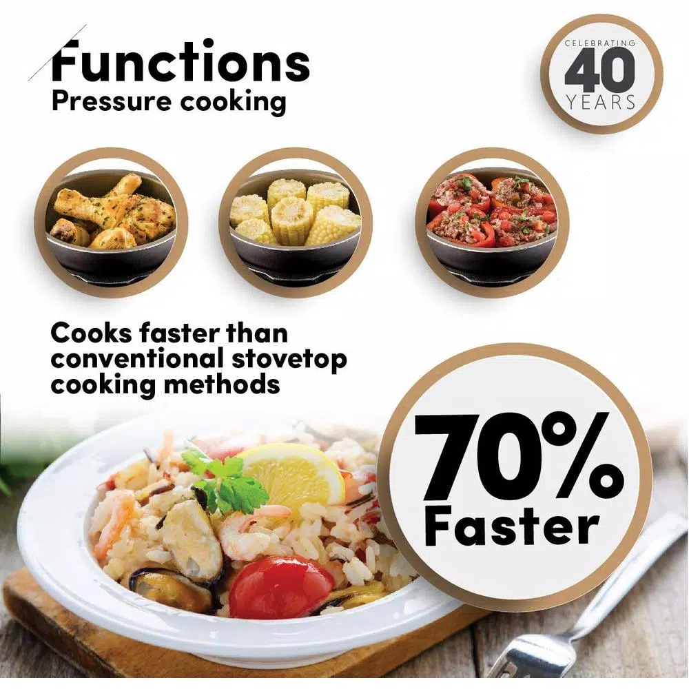 - Cooking functions: brown rice, beans, stew, steam, soup, slow cook, saute then simmer, poultry, porridge, meat, keep warm, fish, delay timer, cake, white rice