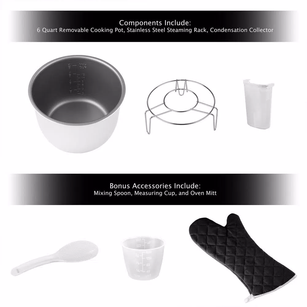 The Classic Cuisine Multi-Cooker helps you cook meals faster while sealing in the juices and flavors. We also include a free Oven Mitt, Measuring Cup and Mixing Spoon. This cooker comes with 10-basic cooking settings, Soup/Stock, Fish/Veg/Seafood, Chicken, Braising, Stew/Chili, Slow Cook, Rice, Multi-Grain, Steam, Potatoes, a Built in Start Delay Timer, a Warmer setting and the ability to adjust time and temperature as you desire.