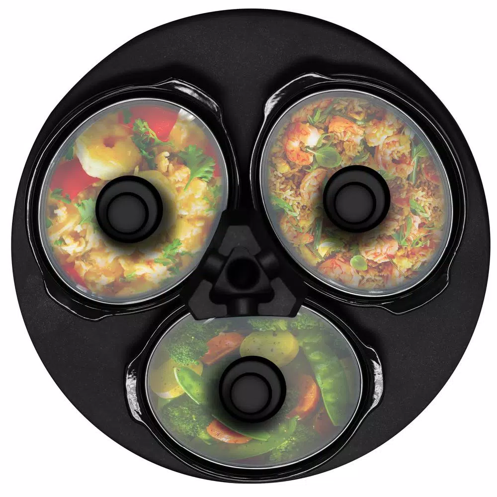 With the New MegaChef Triple 2 Qt. Slow Cooker and Buffet Server in Brushed Silver and Black Finish with 3 Ceramic Cooking Pots and Removable Lid Rests will be your helping hand whenever you need to prepare multiple meals simultaneously without the hustle and bustle of a restaurant kitchen. With this incredible kitchen tool, you will be able to not only cook 3 individual meals at the same time without having to monitor the stove, but you will also be able to keep those meals hot and serve them to your family and friends or guests and coworkers without breaking a sweat. This stunning slow cooker and buffer server features 3 Ceramic 2 Qt. Cooking Pots with their own settings allowing you to control the heat level for each meal you cook. With the included detachable lid rests, your guests can easily serve themselves hassle free. Once you try serving meals with such ease it may be difficult to go without this unit again at any gathering.