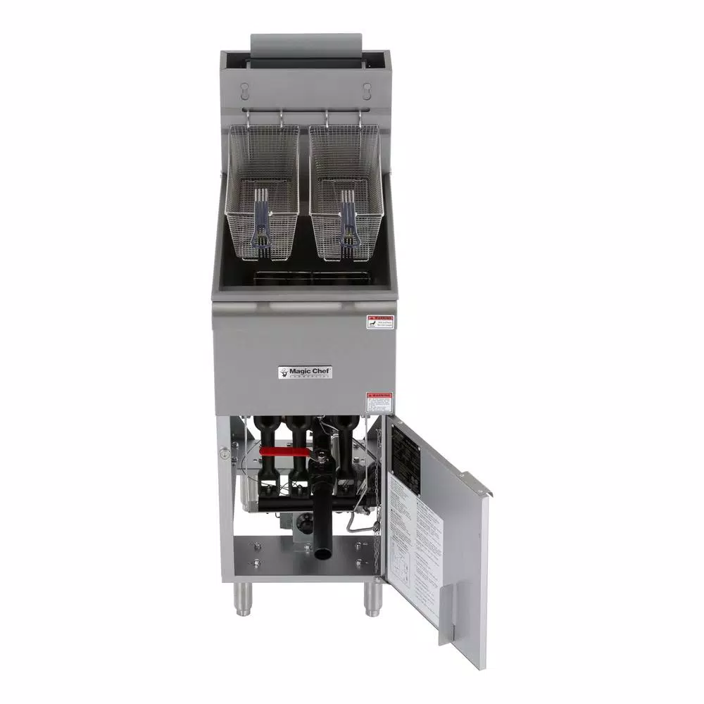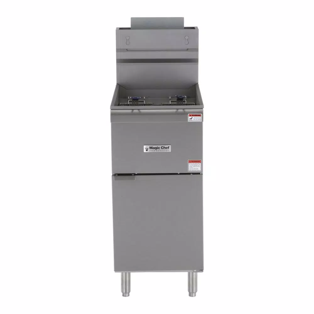 The Magic Chef Commercial deep fryer with 3-burners features 90,000 BTUs of heating power to thoroughly cook your most entrees and sides. With it is 40 lb. oil capacity, it is easy to fry up chicken, French fries, and other fried foods The exterior is made of stainless steel for strength and long-lasting durability. The fry baskets are nickel plated with heat resistant vinyl handles. There is a front drain port, making it very convenient for emptying the oil Natural gas connection is required
