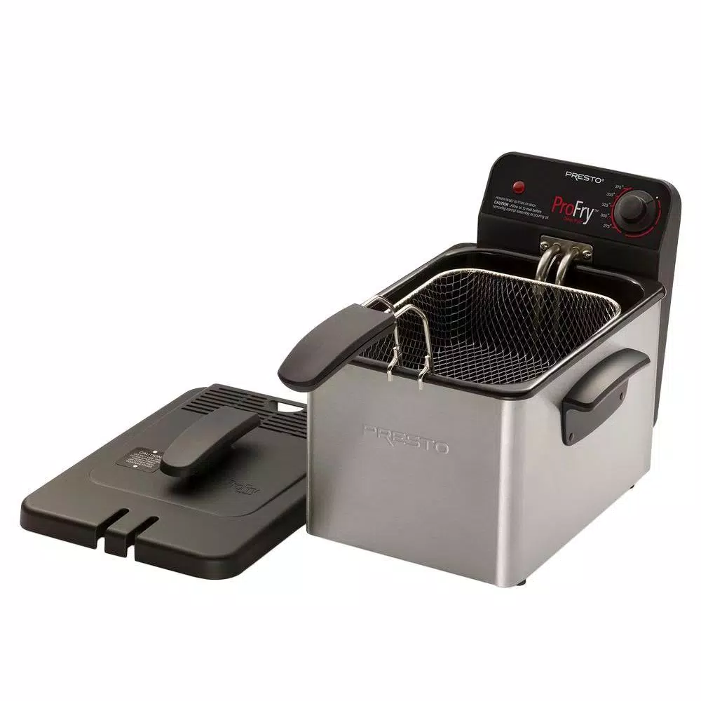 - Cover with filter serves as a splatter shield when lowering foods into hot oil