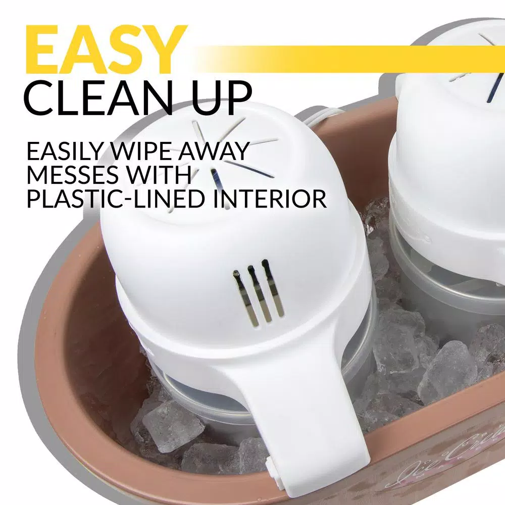 Bring the old-fashioned ice cream Shoppe into the home. This unit includes two 2 qt. aluminum canisters, allowing you to make two flavors of ice cream, gelato or frozen yogurt at the same time. Simply surround the aluminum canisters with ice and rock salt and allow the electric motor to do all the churning.