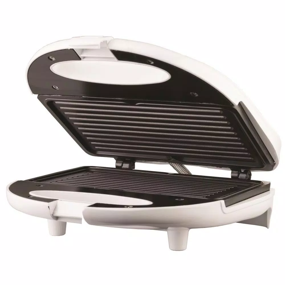 Use the powerful 750-Watt Brentwood Appliances TS-246 NonStick Panini Press and Sandwich Maker to cook 1 to 2 sandwiches in just minutes. The plates heat up quickly and evenly for perfect grill lines. And since the grill plates are nonstick, paninis will slide right off. Convenient power and preheat indicator lights illuminate when unit is on and plates are hot and ready. Nonskid feet keep the unit securely in place. Handles and housing are cool to the touch for added safety. Integrated handles lock for easy carry. This white and silver panini press stands upright with cord wrap for easy storage.
