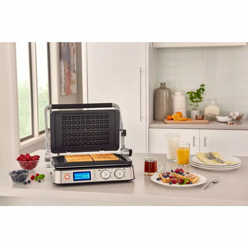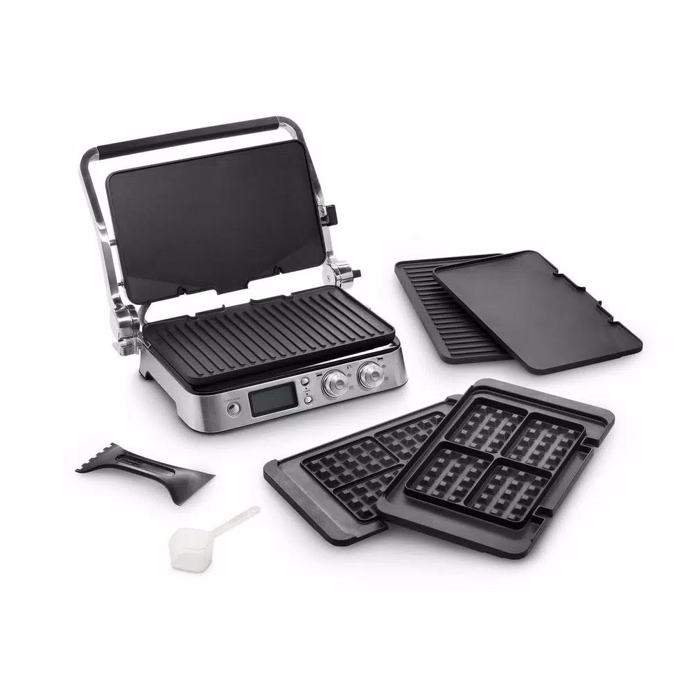 - 6 cooking functions: contact grill & panini press, open full grill, open full griddle, half grill/half griddle, waffle maker