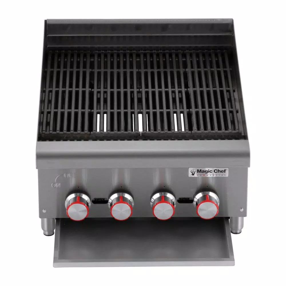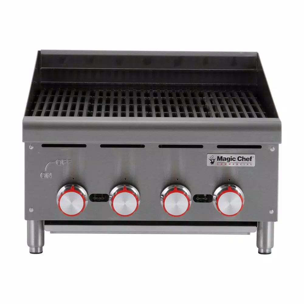 The Magic Chef Commercial 24 in. wide Char broiler lets you prepare delicious grilled foods in your restaurants. It provides 24 in. cooking space depth with it is (4) burners set every 6 in. for better efficiency. Burners are cast iron and feature built in deflectors. The adjustable inline grate is reversible for increased versatility. Grill grates are also heavy duty cast iron. The stainless steel body is built for durability and features a bull nose front edge. It is comfort grip knobs are heavy duty chrome plated, and it is standing pilot allows for quick ignition.