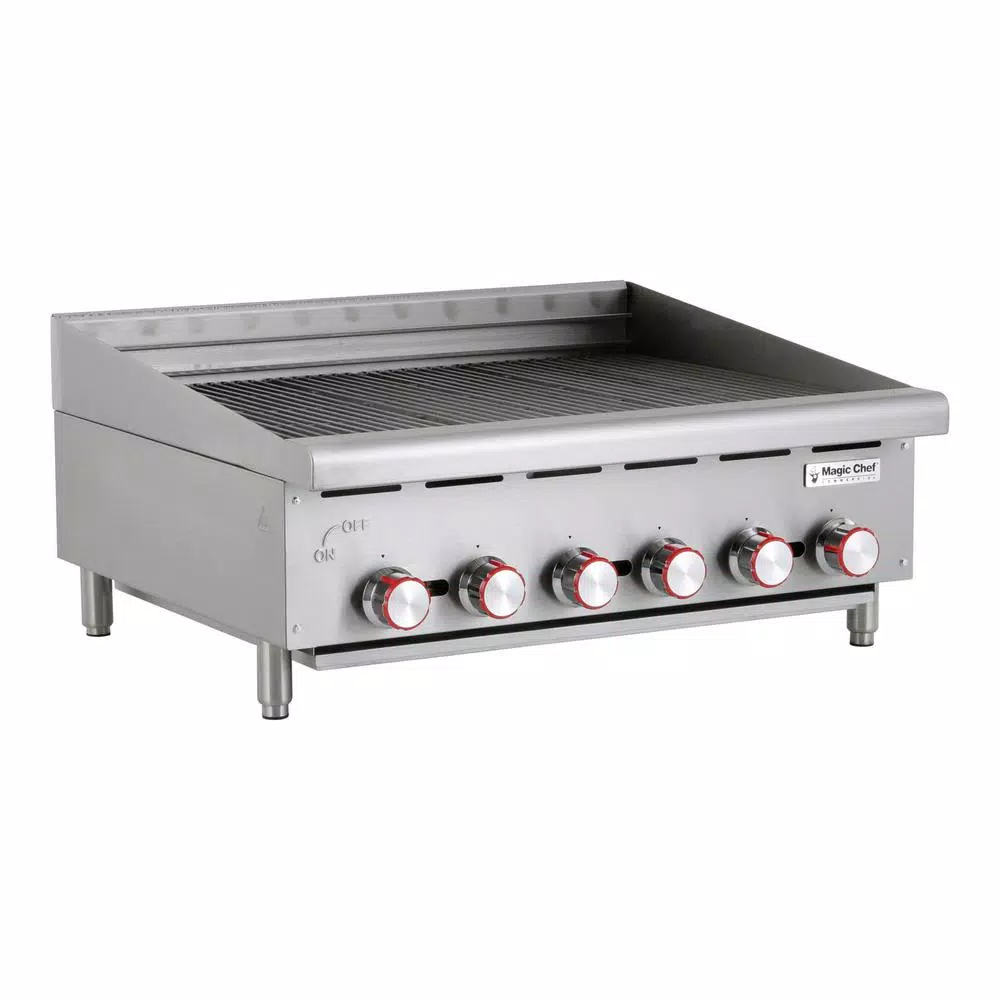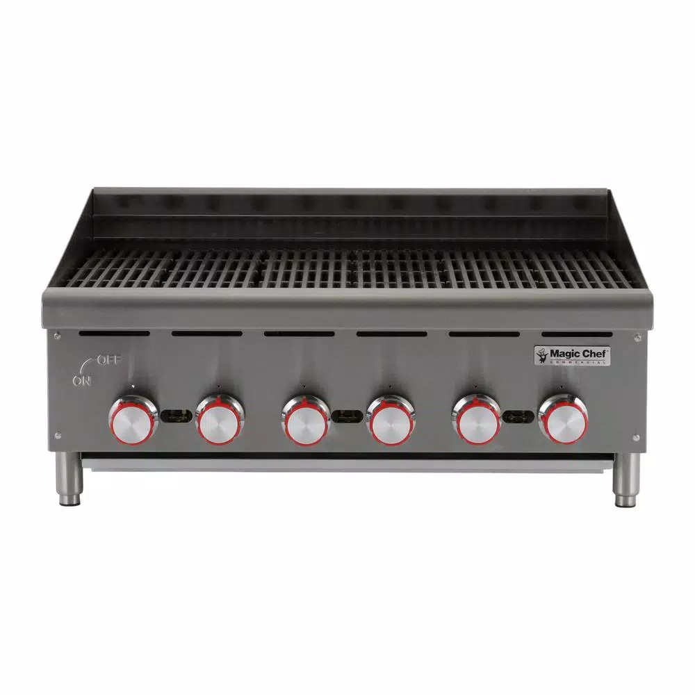 The Magic Chef Commercial 36 in. wide Char broiler lets you prepare delicious grilled foods in your restaurants. It provides 24 in. cooking space depth with it is (6) burners set every 6 in. for better efficiency. Burners are cast iron and feature built in deflectors. The adjustable inline grate is reversible for increased versatility. Grill grates are also heavy-duty cast iron. The stainless-steel body is built for durability and features a bull nose front edge. It is comfort grip knobs are heavy duty chrome plated and it is standing pilot allows for quick ignition.
