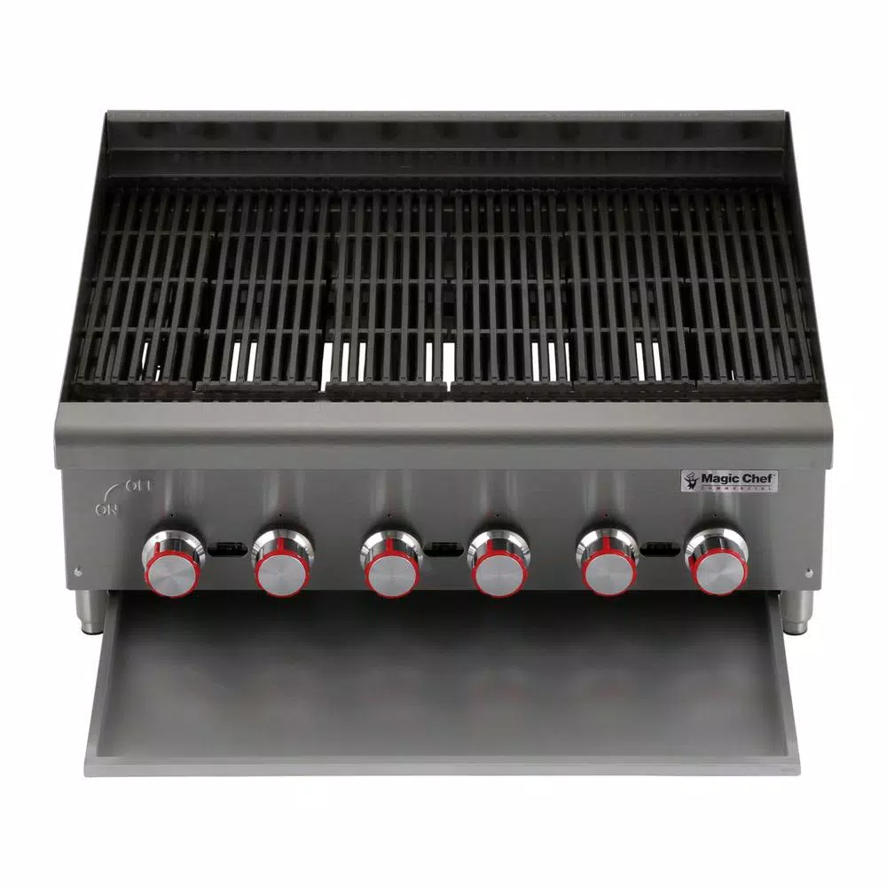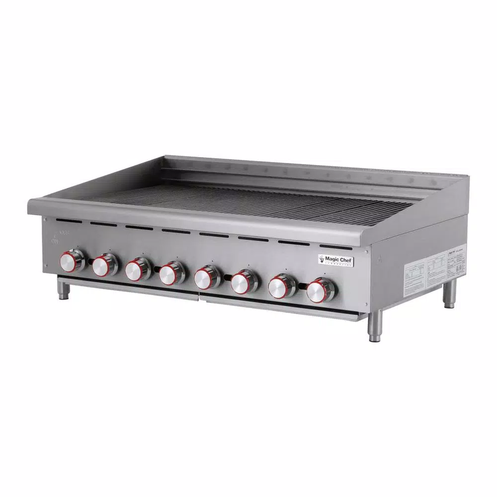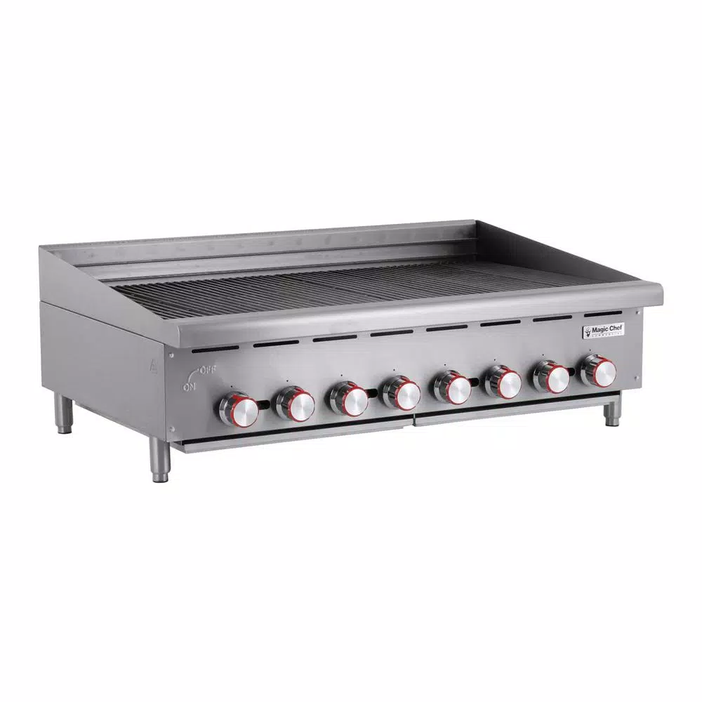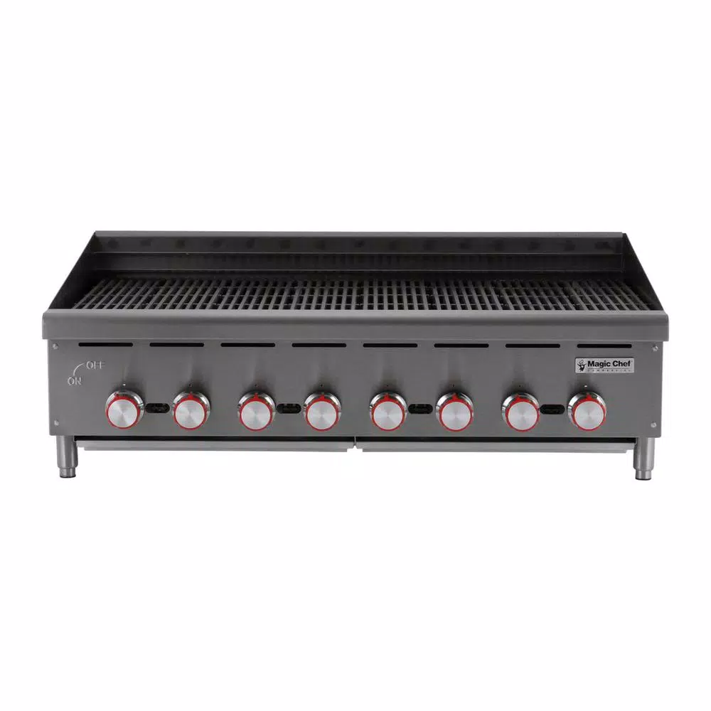 The Magic Chef Commercial 48 in. wide Char broiler lets you prepare delicious grilled foods in your restaurants. It provides 24 in. cooking space depth with it is (8) burners set every 6 in. for better efficiency. Burners are cast iron and feature built in deflectors. The adjustable inline grate is reversible for increased versatility. Grill grates are also heavy duty cast iron. The stainless steel body is built for durability and features a bull nose front edge. It is comfort grip knobs are heavy duty chrome plated, and it is standing pilot allows for quick ignition.