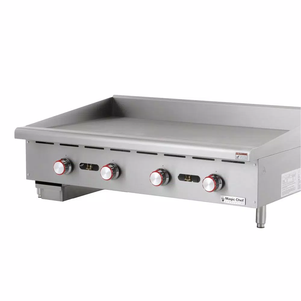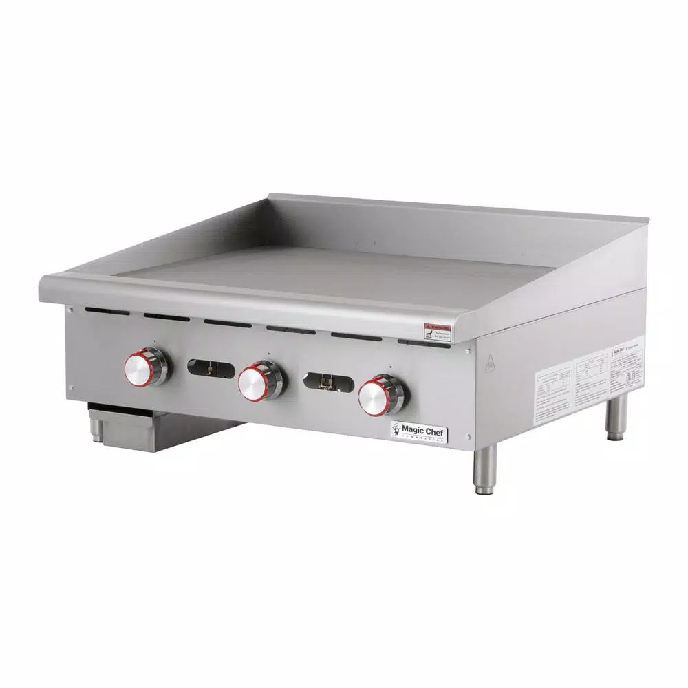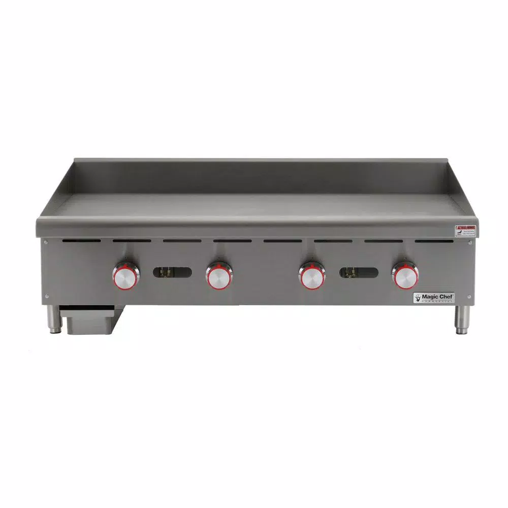 The Magic Chef Commercial 48 in. thermostatic countertop griddle is an efficient and durable addition to a commercial kitchen. The cooking surface is 24 in. deep; with the cooking surface in total an ample 1140 sq. in. The burners are U-shaped and are placed every 12 in. for efficient heating. The temperature probe is embedded for more accurate cooking performance. Back and side splashes are stainless steel and are designed to help keep your work environment cleaner. Includes a drip tray for easy cleaning Adjustable legs allow you to customize the height according to your food preparation needs.
