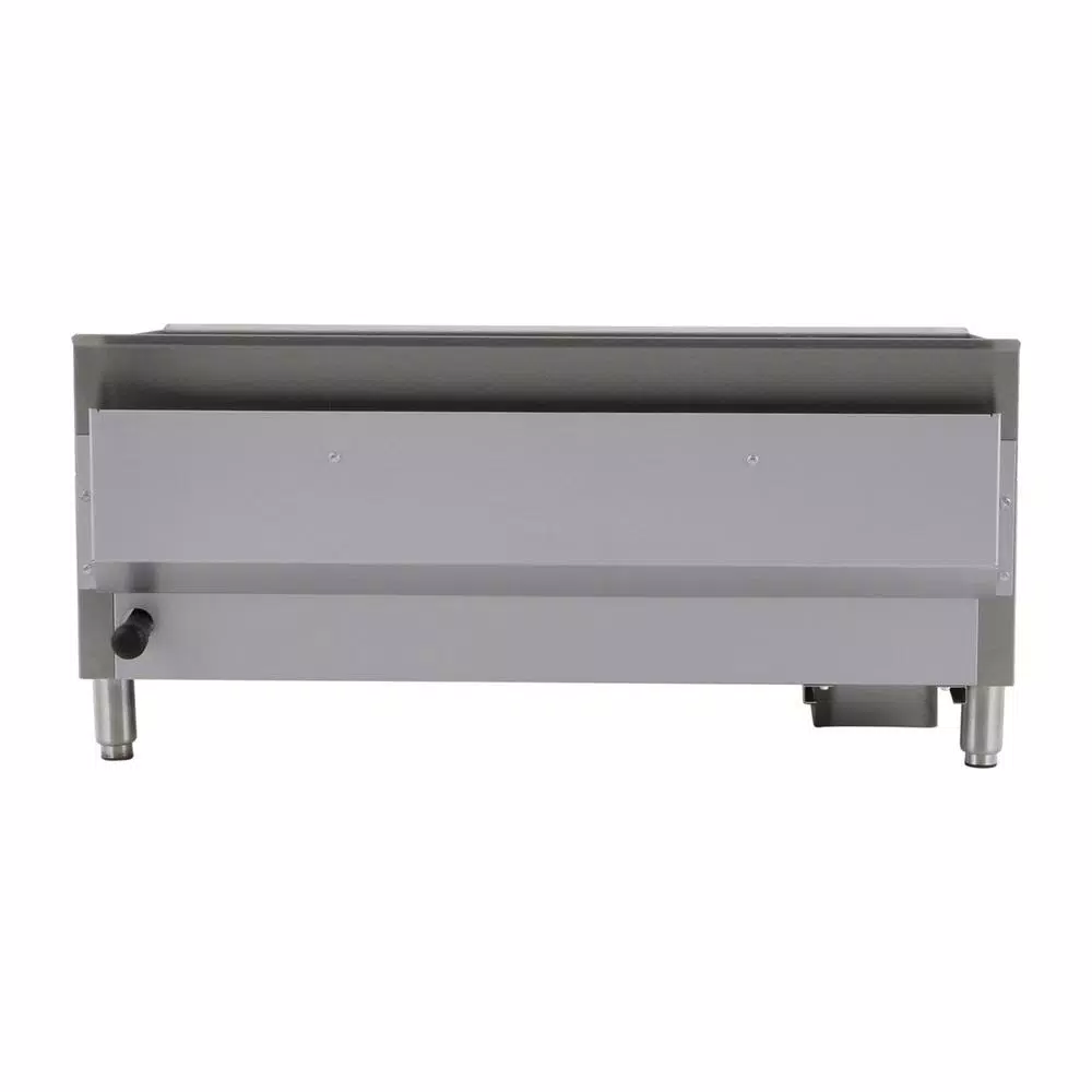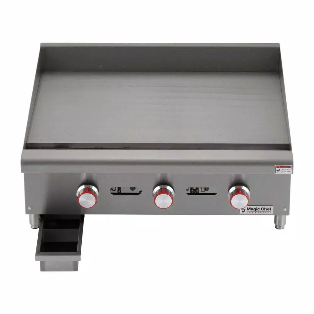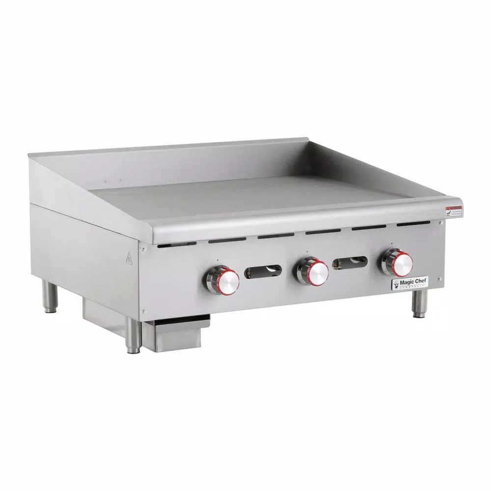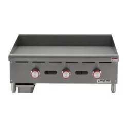 The Magic Chef Commercial 36 in. wide thermostatic countertop griddle is an efficient and durable addition to a commercial kitchen. The cooking surface is 24 in. deep; with the cooking surface in total an ample 856.8 sq. in. The burners are u-shaped and are placed every 12 in. for efficient heating. The temperature probe is embedded for more accurate cooking performance. Back and side splashes are stainless steel and are designed to help keep your work environment cleaner. Includes a drip tray for easy cleaning Adjustable legs allow you to customize the height according to your food prep needs.