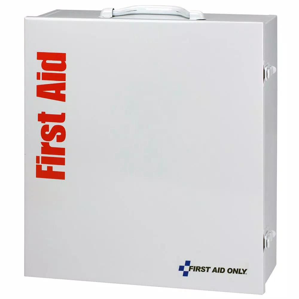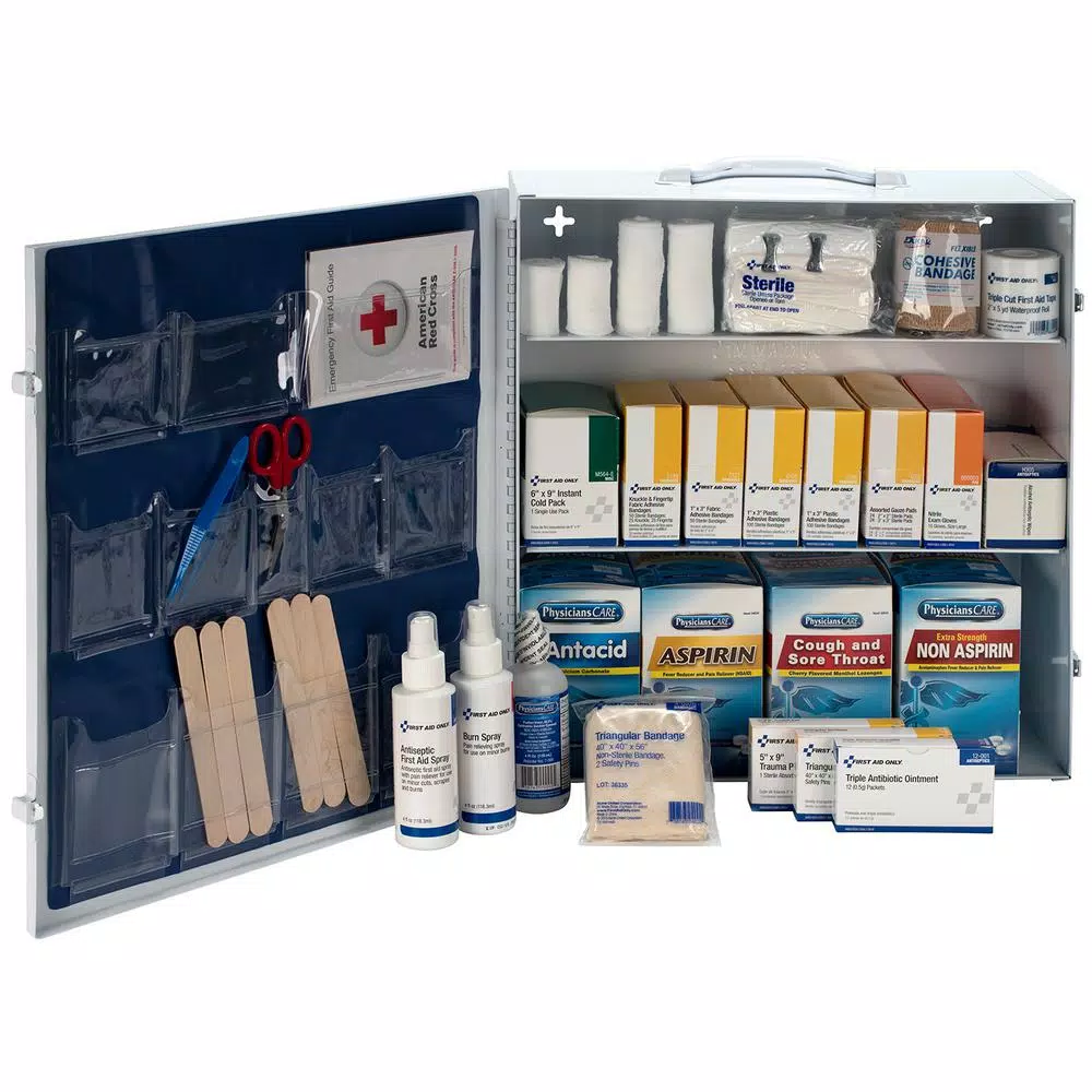 This 3-shelf, 1,092-Piece industrial first aid station is designed for medium sized businesses, offices and work sites and can act as a satellite first aid cabinet for buildings, wings or departments and serves up to 100 people. Meets OSHA regualtions. The metal cabinet holds a wide variety of items, and the 12-pocket vinyl inside door liner adds valuable storage space. The swing-out door and easy-to-carry handle add extra convenience. The wide variety of products is designed to handle first aid emergencies from burns, major bleeding and eye injuries to discomfort from minor cuts and abrasions.