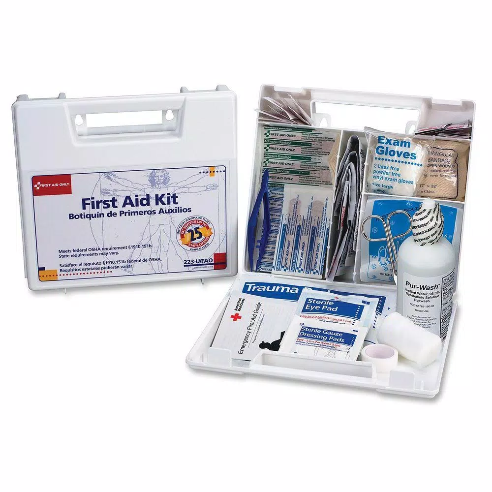 This SmartCompliance first aid kit is ideal for contractors, fleet vehicles, worksites or small companies up to 25 employees. This kit meets federal OSHA recommendations and includes 17 critical products including a 4 oz. eyewash. Water-resistant plastic case is wall-mountable and features a handle for easy carrying.