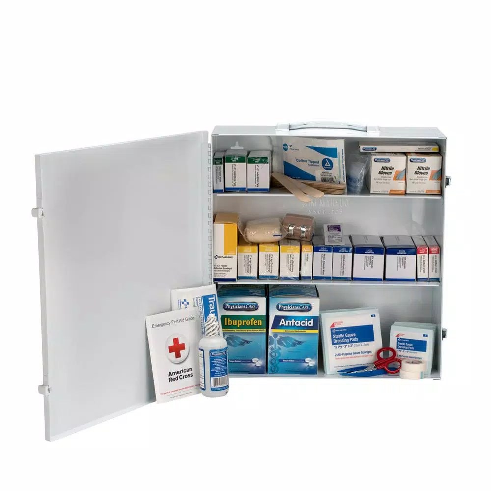 The PhysiciansCare 694-Piece Industrial ANSI/OSHA First Aid Cabinet for 100 Persons is a 3-shelf industrial first aid metal cabinet. This heavy duty first aid station is perfect for large office settings or manufacturing facilities and is wall mountable. This OSHA approved kit features a large assortment of first aid products to assist in almost any emergency situation. A carrying handle is built into the cabinet allowing you to easily move this kit to the accident site.