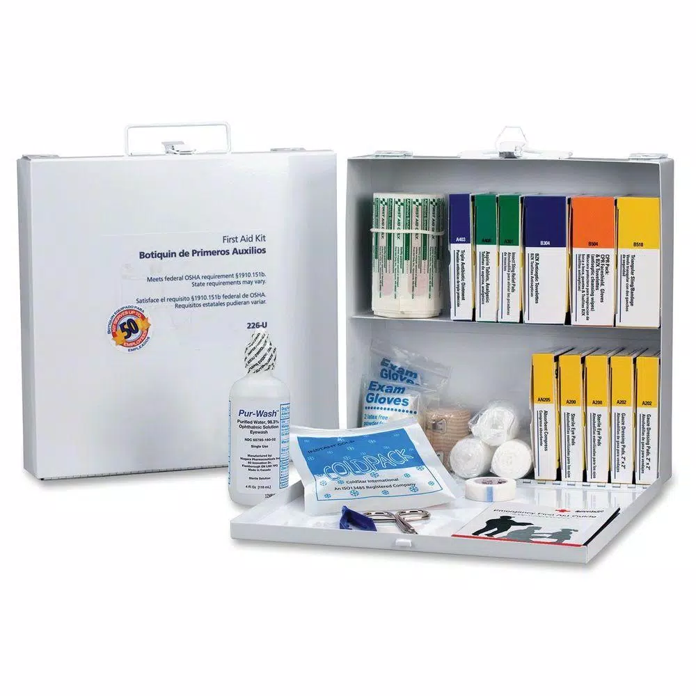 Quickly treat injuries with this first aid kit that is designed for contractors, fleet vehicles, worksites or small companies with up to 50 employees. Wall-mountable, plastic case features a carrying handle for easy transportation to the injured person. Kit meets federal OSHA recommendations and carries 20 critical products. Items include adhesive plastic bandages, absorbent gauze compress, gauze dressing pads, conforming gauze roll bandages, sterile eye pads, first aid tape roll, triangular sling/bandage, latex-free elastic bandage, antiseptic cleansing wipes, triple antibiotic ointment packs, aspirin tablets, instant cold compress, exam-quality gloves, scissors (nickel-plated), tweezers (plastic), eyewash, insect sting relief pads, CPR Pack (rescue breather CPR one-way valve face shield, exam-quality gloves and antiseptic wipes) and first aid guide.