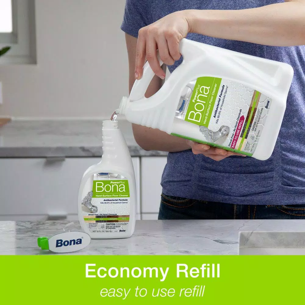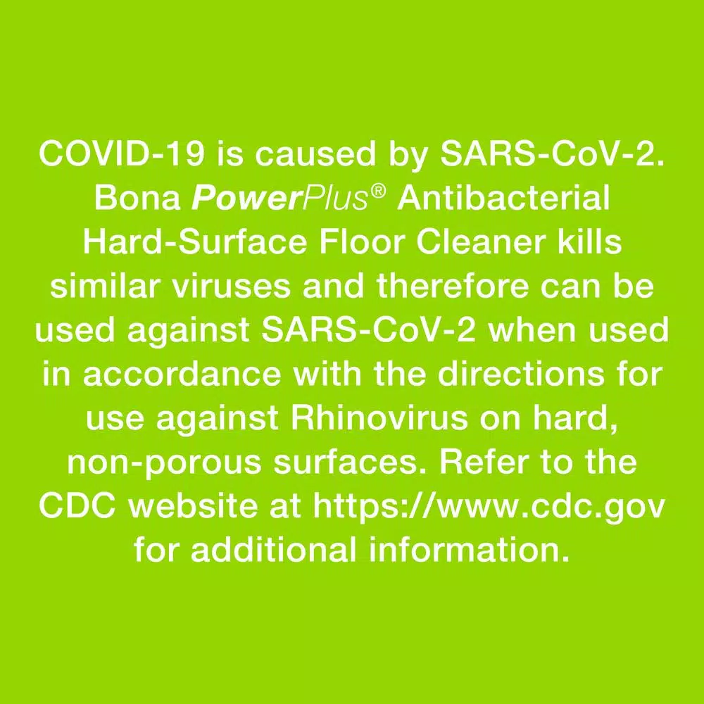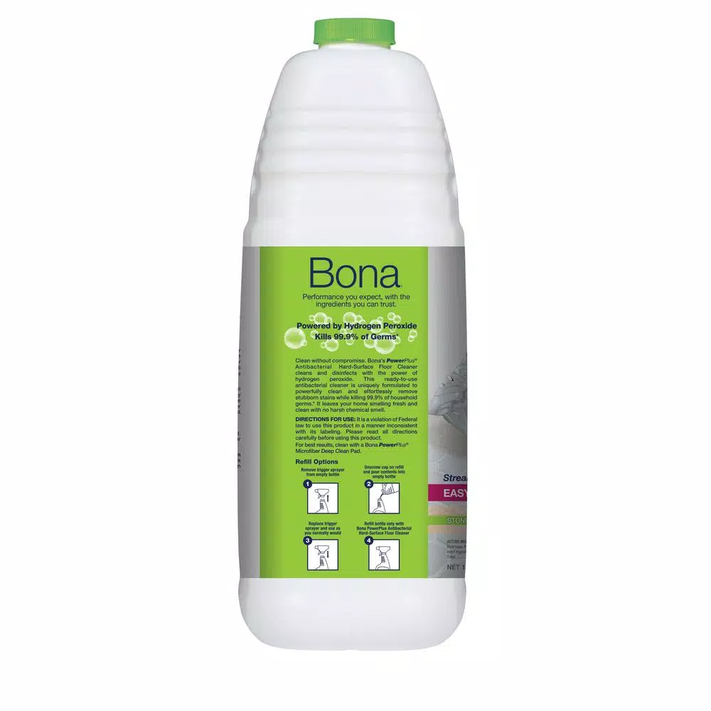 Performance you expect, with the ingredients you can trust. Clean without compromise. Bona’s PowerPlus Antibacterial Hard-Surface Floor Cleaner cleans and disinfects with the power of hydrogen peroxide. This ready to use antibacterial cleaner is uniquely formulated to powerfully clean and effortlessly remove stubborn stains while killing 99.9% of household germs. It leaves your home smelling clean and fresh with no harsh chemical smell. For best results, clean with a Bona PowerPlus Microfiber Deep Clean Pad. Directions for use: Step #1: Vacuum, sweep or dust mop Step #2: -To Clean: Mist, and then proceed to step #3 OR -To Disinfect: Spray until thoroughly wet, wait 10-minutes, then proceed to step #3 Step #3: Clean. Rinse and wring cleaning pad often to avoid streaking.