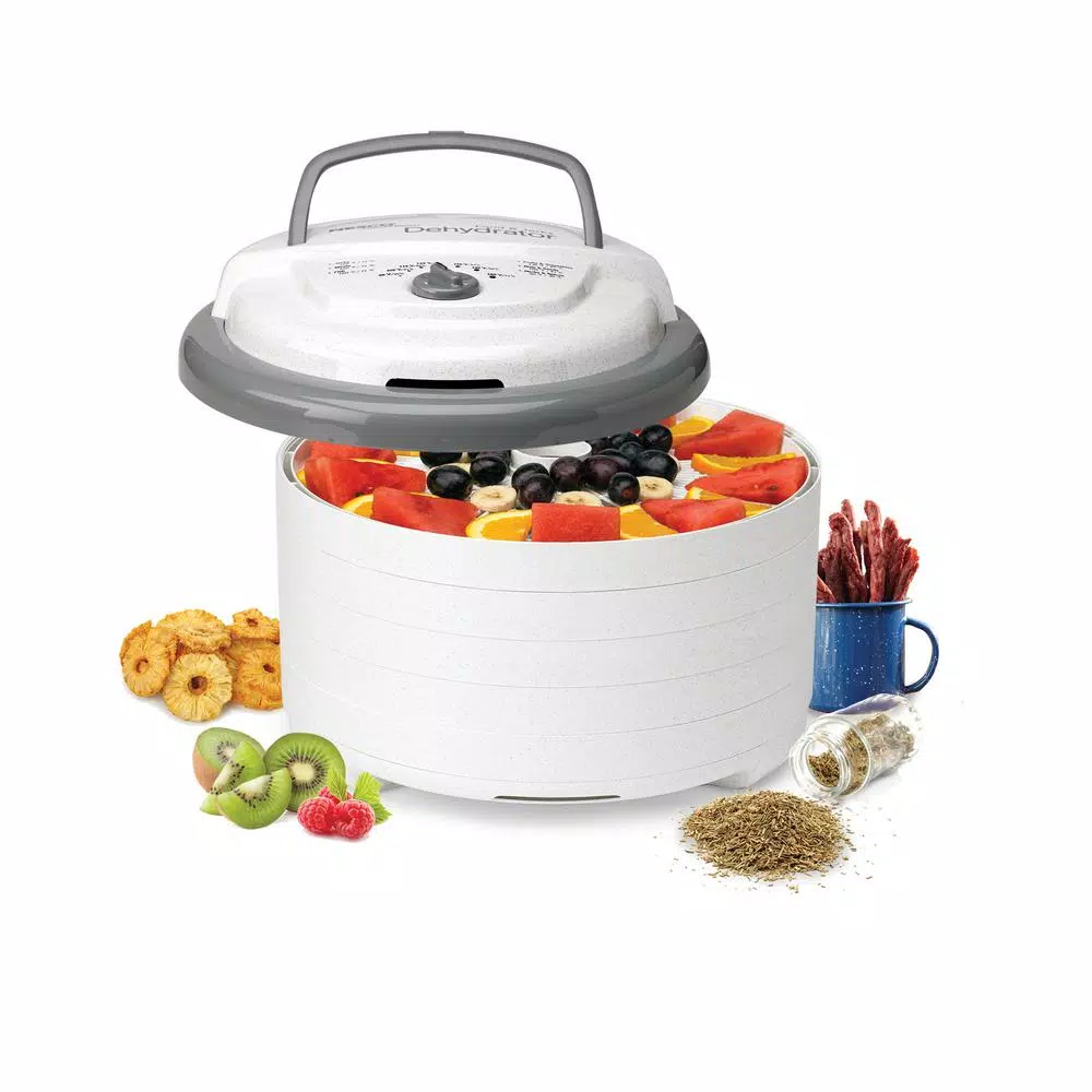 The Snackmaster Pro is one of the newest dehydrators in the Nesco/American Harvest product line. It’s sleek, contemporary design In grey and marble color features a top mounted fan, 600-Watt of drying power and generates maximum speed and quality for dehydrating fruits, vegetables, beef jerky and venison jerky. Helps dry food in hours, not days like ordinary food dehydrators. Makes delicious Beef Jerky even turkey jerky and fish jerky. Make trail mix, homemade yogurt, apple snacks, banana chips, dried soup mixes, dried tomatoes, watermelon, cantaloupe, honeydew, mangoes, papaya and other dried fruits at a fraction of the cost. Make dried herbs and spices; also make potpourri and dried flowers for any occasion.