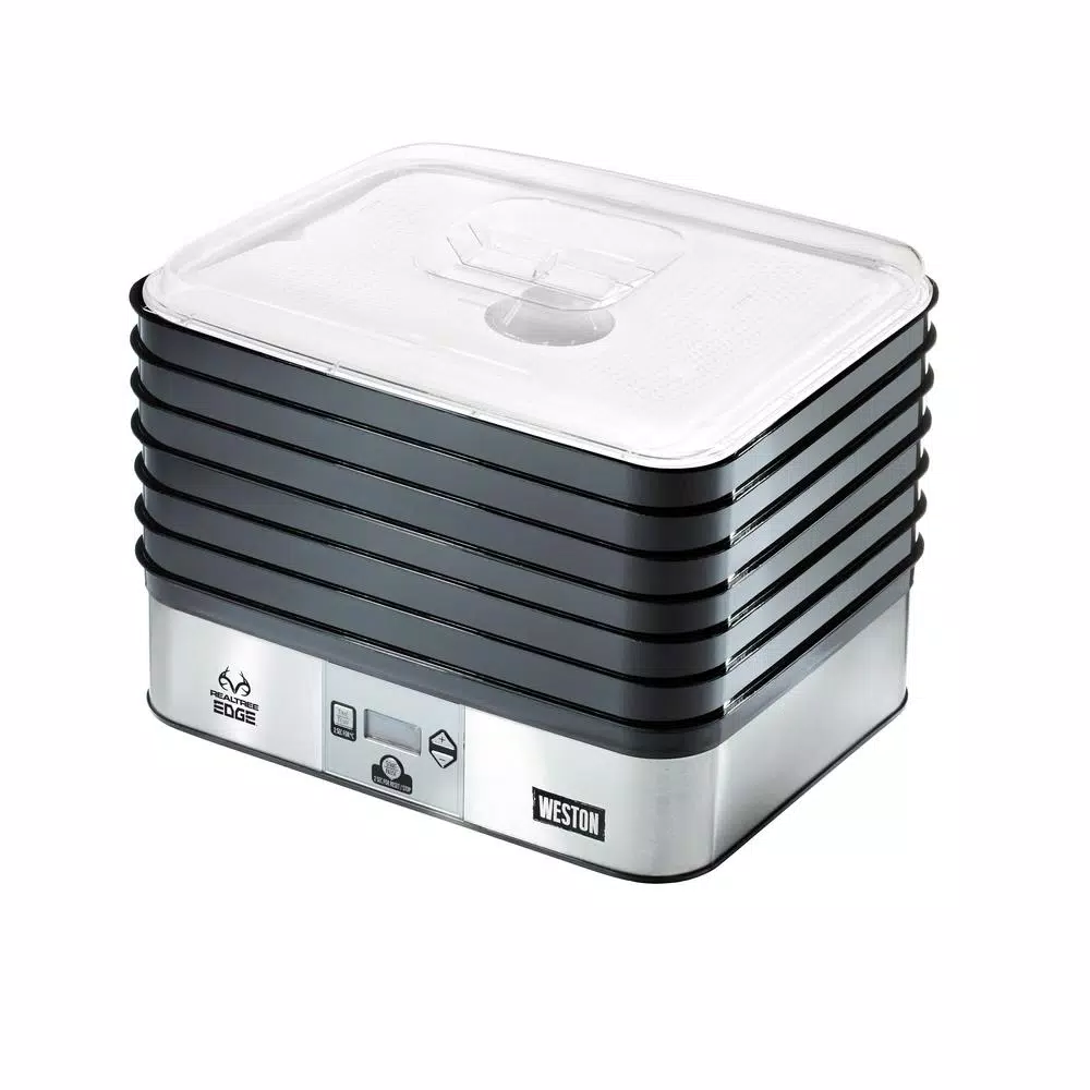 The Realtree Edge by Weston 6 Tray Digital Food Dehydrator Plus is the perfect tool to preserve foods for later use. Use to dry the season’s harvest for meats, making jerky and a variety of snacks. Ideal for making banana chips, fruit rollups, dried herbs, fruits and vegetables. The adjustable digital thermostat lets you adjust the drying temperature from 100° F – 160° F and has a 48 hour timer with automatic shut off. The continuous air flow provides even drying for better taste. Includes one fine-mesh sheet for drying small foods like herbs and one solid sheet for making fruit roll ups. Includes a Realtree Edge storage cover.