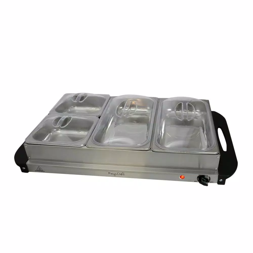 The MegaChef Buffet Server and Food Warmer With 4 Removable Sectional Trays, Heated Warming Tray and Removable Tray Frame is designed with you in mind. This ultimate party sidekick will make your guests feel as though they are being served a delicious hot meal at the most exclusive banquet. You will love the versatility of this wonderful buffet server at your next party or gathering. If you are in need of keeping prepared meals warm enough to serve through out the day or night this server has you covered. This large capacity buffet server and warming tray offer you the ability to serve food that may be warmed in the stainless steel containers or on the warming tray which is the base of the unit. The warming tray comes with hard mounted side handles to ensure that you can easily transport your buffet server from one location to another without worry. This lightweight and compact portable food warmer is safe to use on your kitchen counters or serving tables.