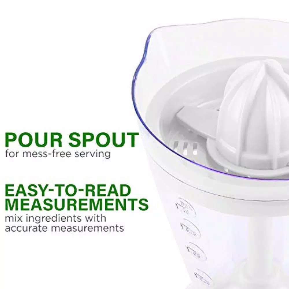- Practical citrus juicer the clear 34-oz. juice container has easy-to-read measurements so you can juice and mix other ingredients accurately, it also has a pour spout for convenient serving