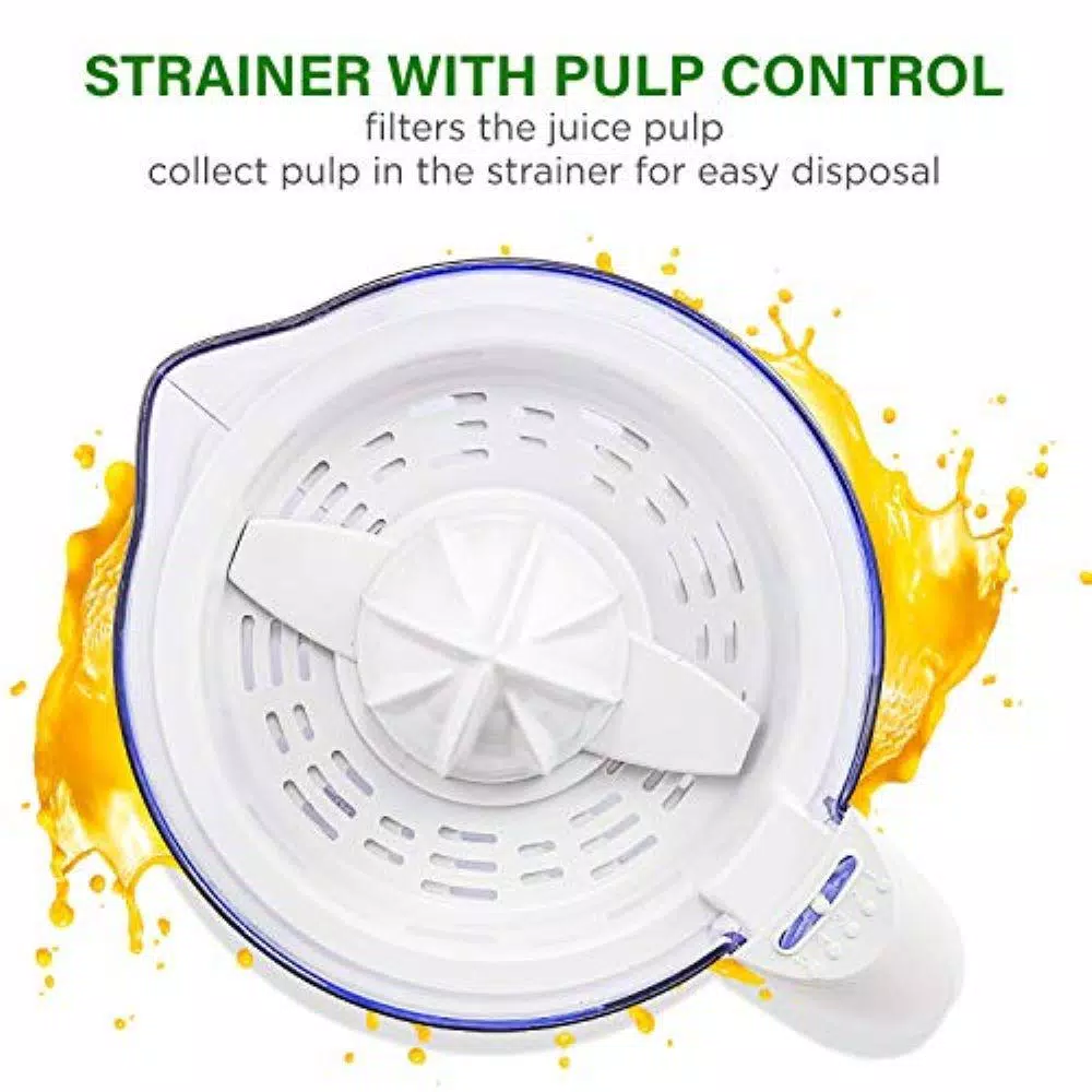 - Control the pulp this 25-Watt juicer features a strainer with pulp control, you can choose from the 5 filter settings to filter the juice pulps and collect it all in the strainer so you can get the juice as pure as you prefer. Plus, you can take the filtered pulps from the strainer that you can use for broths, smoothies, scrambled eggs, and baked goods