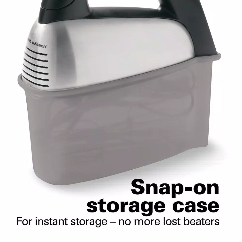 Hamilton Beach hand mixers are powerful and are designed with a focus on versatility and ergonomics. Features convenient snap-on storage cases, which keep attachments together so you don’t have to search for them each time you need to mix. Hamilton Beach hand mixers have handles that are designed for control and comfort, and the unique Bowl Rest feature allows the mixer to sit on the edge of the bowl to eliminate messy drips. A special QuickBurst button provides a quick boost of power and can be used for tough tasks at any speed. Features include a snap-on storage case. 290 watts peak power makes mixing easy. Convenient mixing features including QuickBurst button and Bowl Rest. Versatile attachment set includes traditional beaters, wire beaters and whisk. Brushed stainless steel housing.