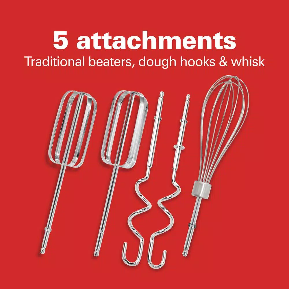 - 5-attachments: 2-traditional beaters, 2-dough hooks and 1-whisk