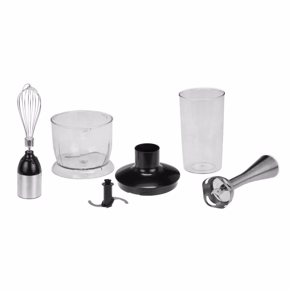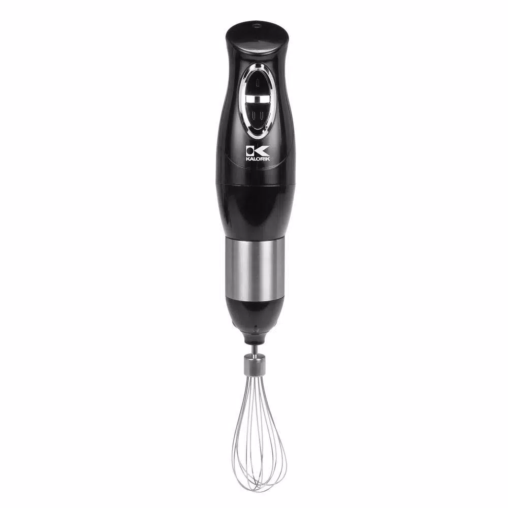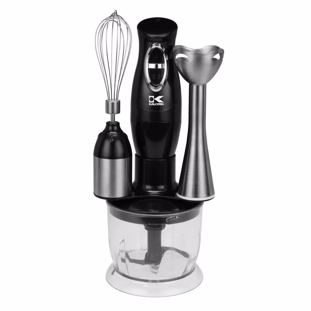 This 3-in-1 mixing set by KALORIK is the perfect marriage between function and design. Keep everything needed for quick food prep neatly organized and within reach thanks to this three -in-one combination stick mixer. The unit provides a handle with a decorative chrome panel for a secure grip and a long stainless steel shaft that reaches effortlessly into a pot for pureeing soup or into the mixing cup provided for blending up protein shakes or fruit smoothies. Best of all, the appliance converts from a stick mixer to a whisk with a simple twist, to make homemade whipped cream or tasty mayonnaise, and it can be attached to the included chopper for chopping up green pepper, onion, garlic, and more in seconds. The full mixing set with its entourage of accessories stores elegantly with the help of its convenient holder.