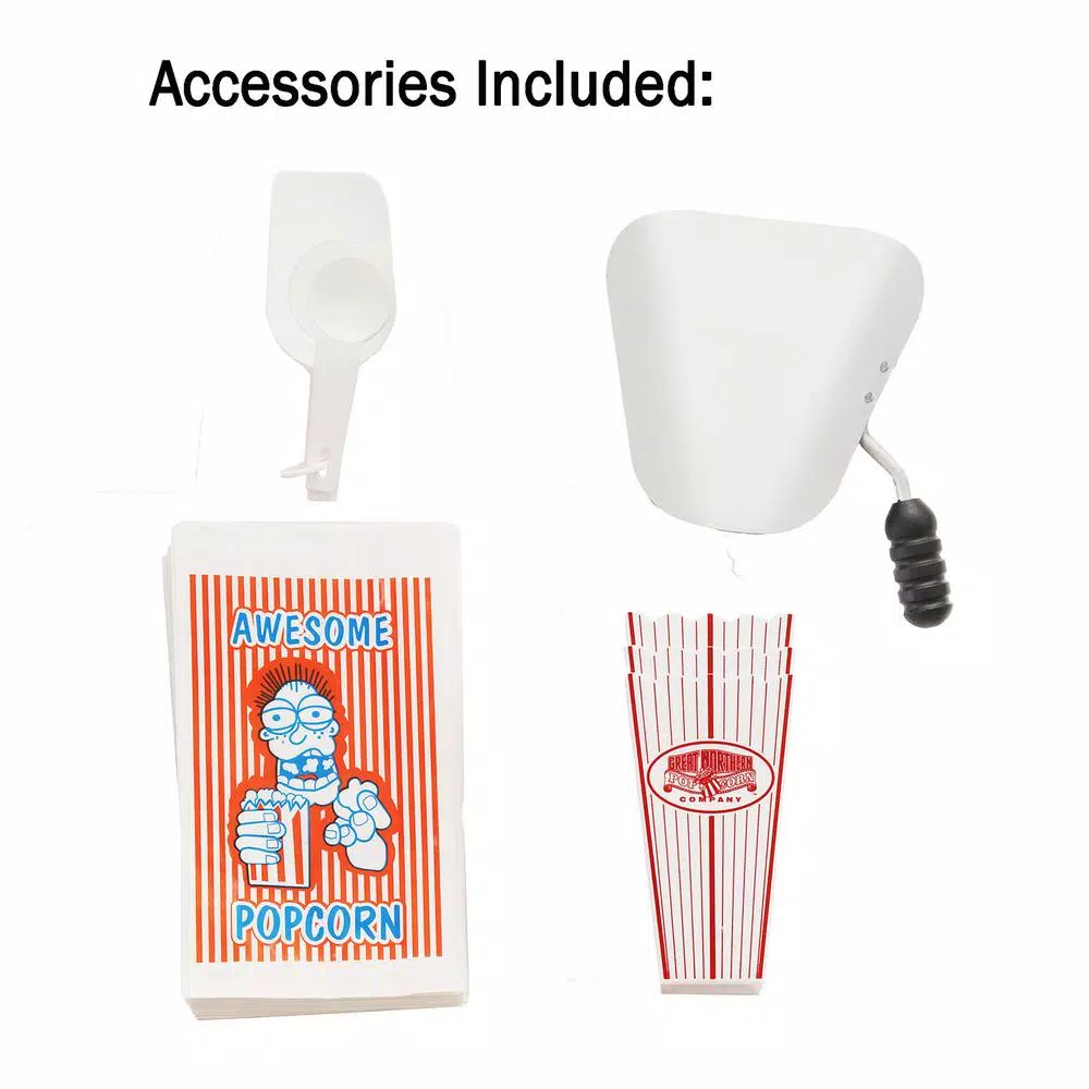 - Product details material: metal, stainless steel and tempered glass dimensions: 17.1 in. L x 14.1 in. W x 24 in. H weighs: 28 lbs. includes: 3-plastic cups, 25-popcorn bags and scoop 110-Volt, 850-Watt ETL approved color: red