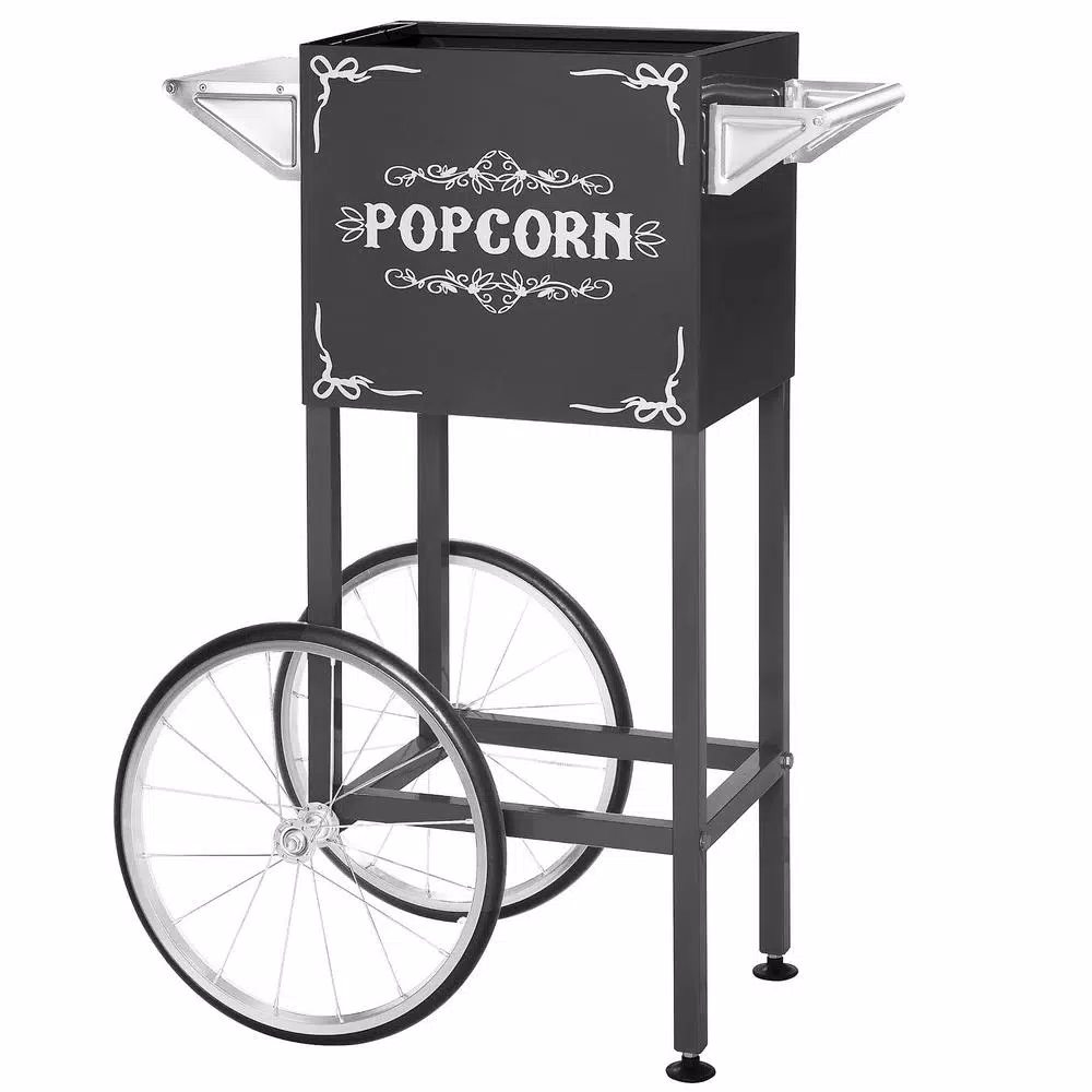 - PRODUCT DETAILS-Material: Metal, Stainless Steel & Polycarbonate Door. Dimensions: 27.5 L x 18 W x 57 H inches; 43lb. Machine: 17.1 L x 14.1 W x 20.8 H inches. Cart: 27.5 L x 18 W x 36.6 H inches. Includes: 3 Plastic Cups, 25 Popcorn Bags & Scoop. 110V 640W ETL Approved.