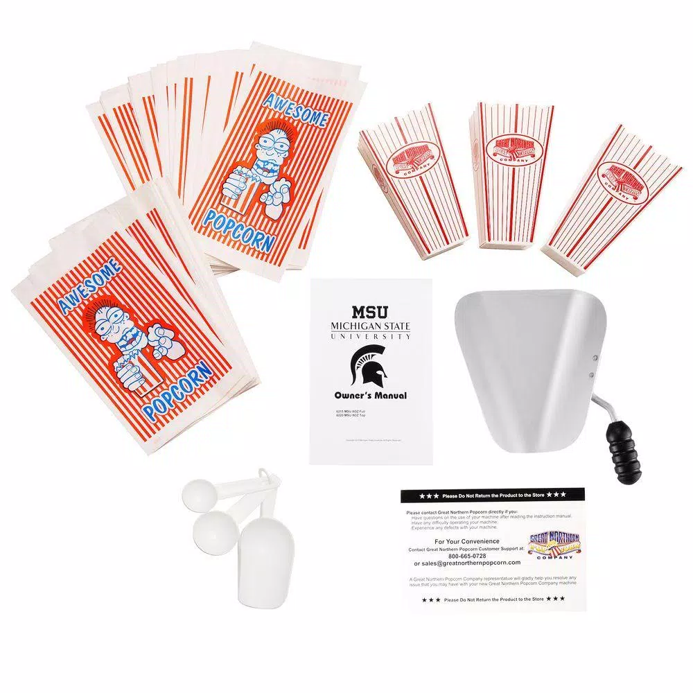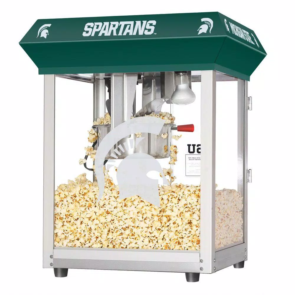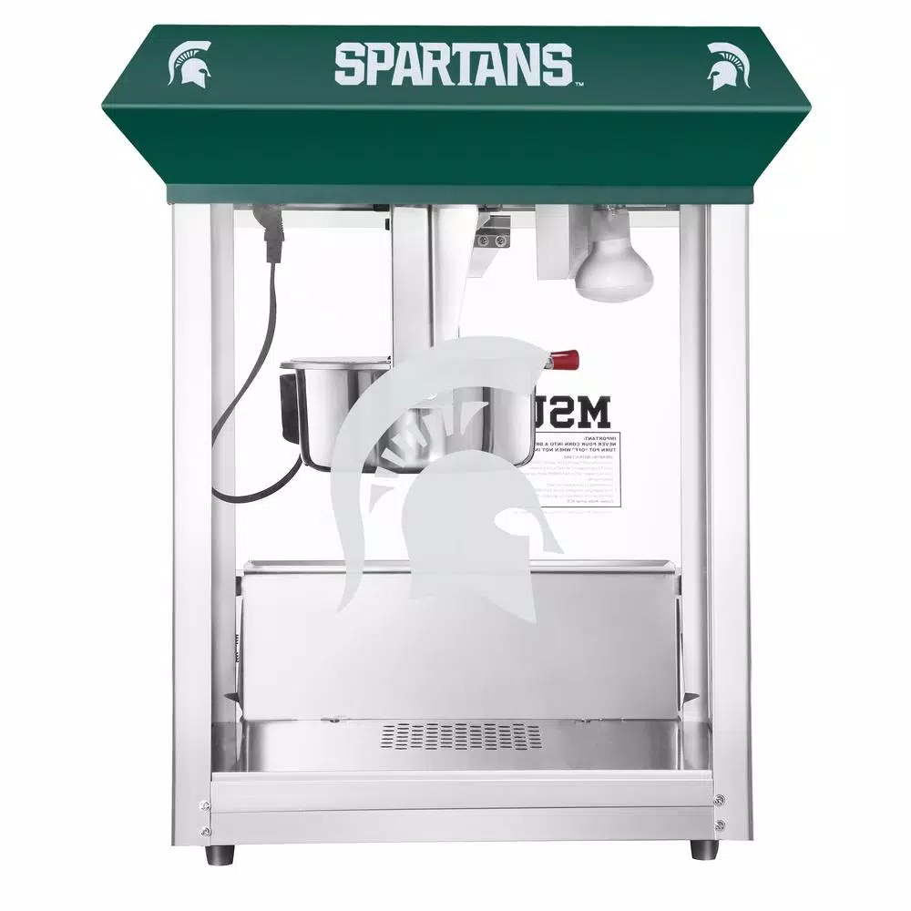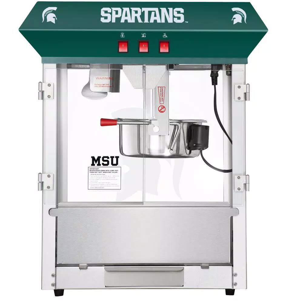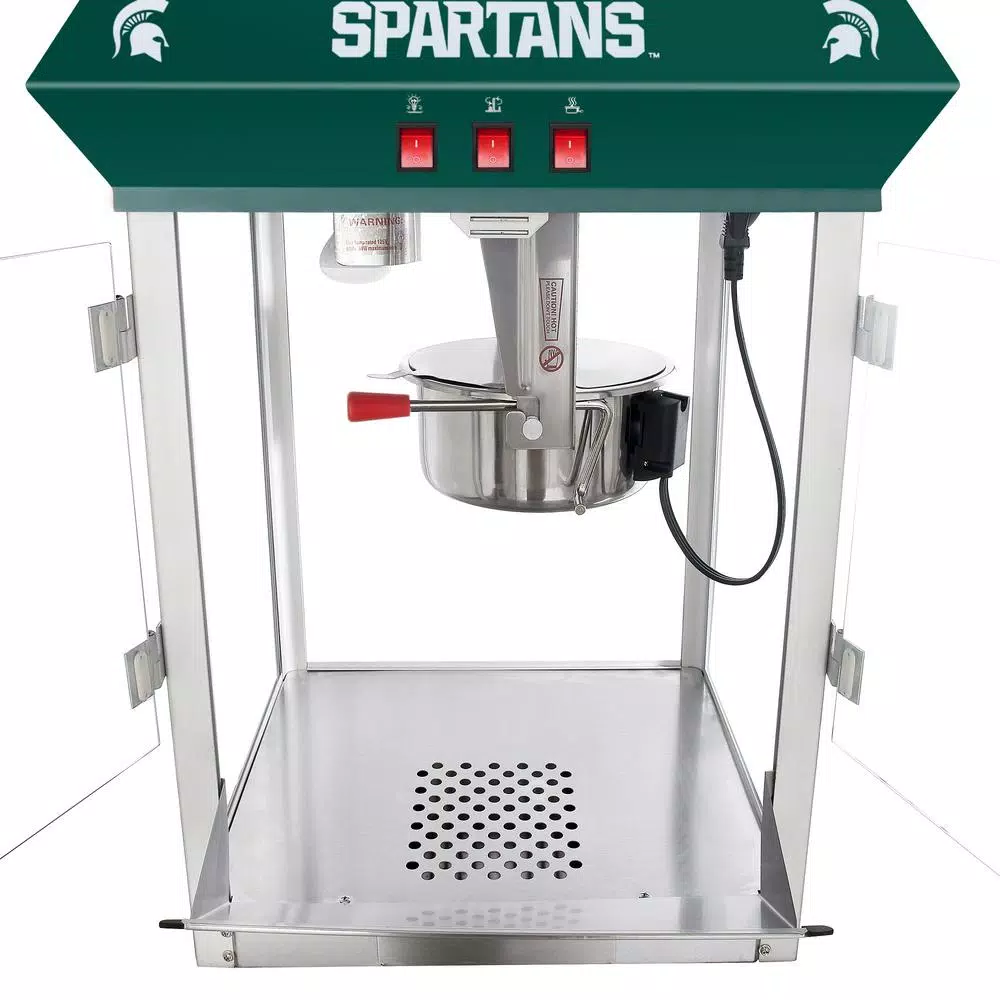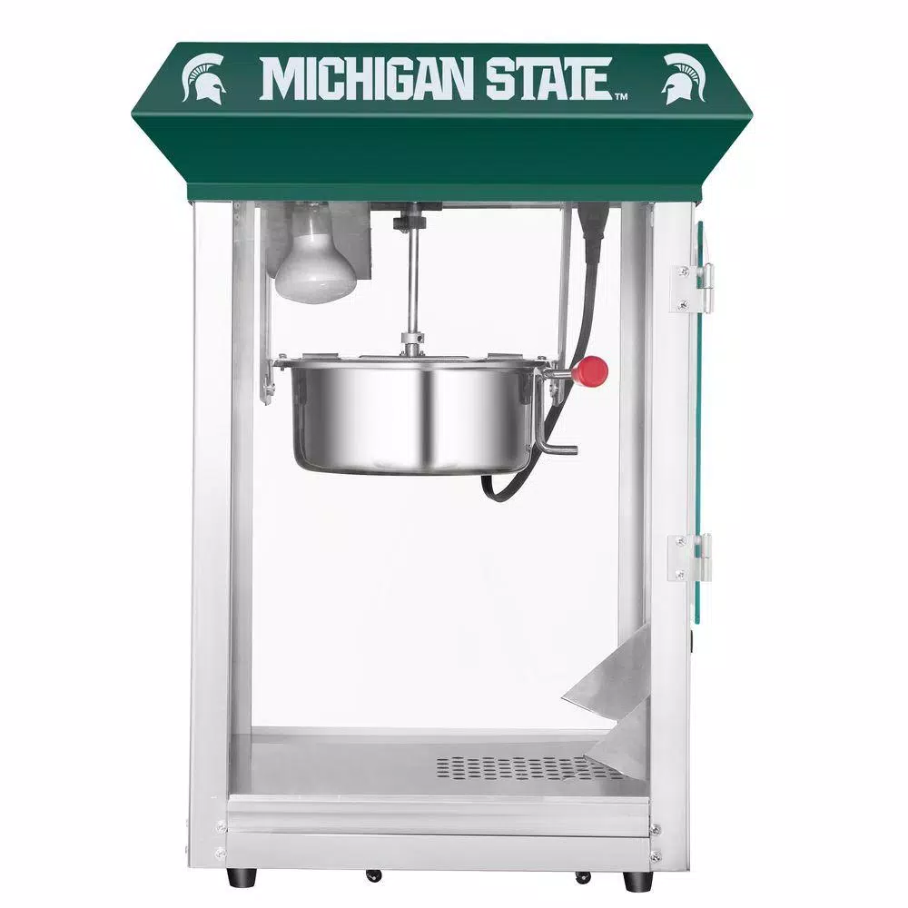 Michigan State Spartans fan know that the world is made up of only two colors; Green and White. Great Northern Popcorn Company is proud to offer its finest popcorn machine 100% licensed by Michigan State to carry the logo and branding of MSU. Sparty on. These commercial quality machines feature stainless steel food-zones, easy cleaning stainless steel kettles, heated warming decks, old-maid drawers (for un-popped kernels), tempered glass side and back panels and an industry leading 8 oz. kettle operating on 860-Watt. Our machine was designed with small perforations in the bottom stainless tray to allow the un-popped kernels to fall into the drawer. Simply rake the popped corn with a scoop and the old-maids disappear. Additional Features: Works on standard 110-Volt. Top Machine is 25 in. H x 21 in. L x 18 in. D Weighs roughly 45 lbs. 8 oz. Kettle Warming Deck to keep the popcorn warm and fresh. 3 Switch Design.