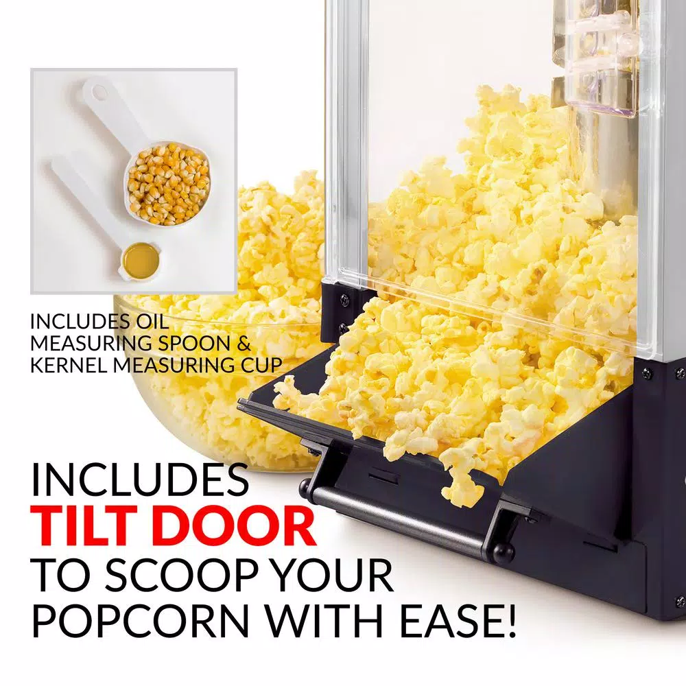 - Included: includes kernel and oil measuring cap/spoon to make sure you use the proper amount of kernels for each batch