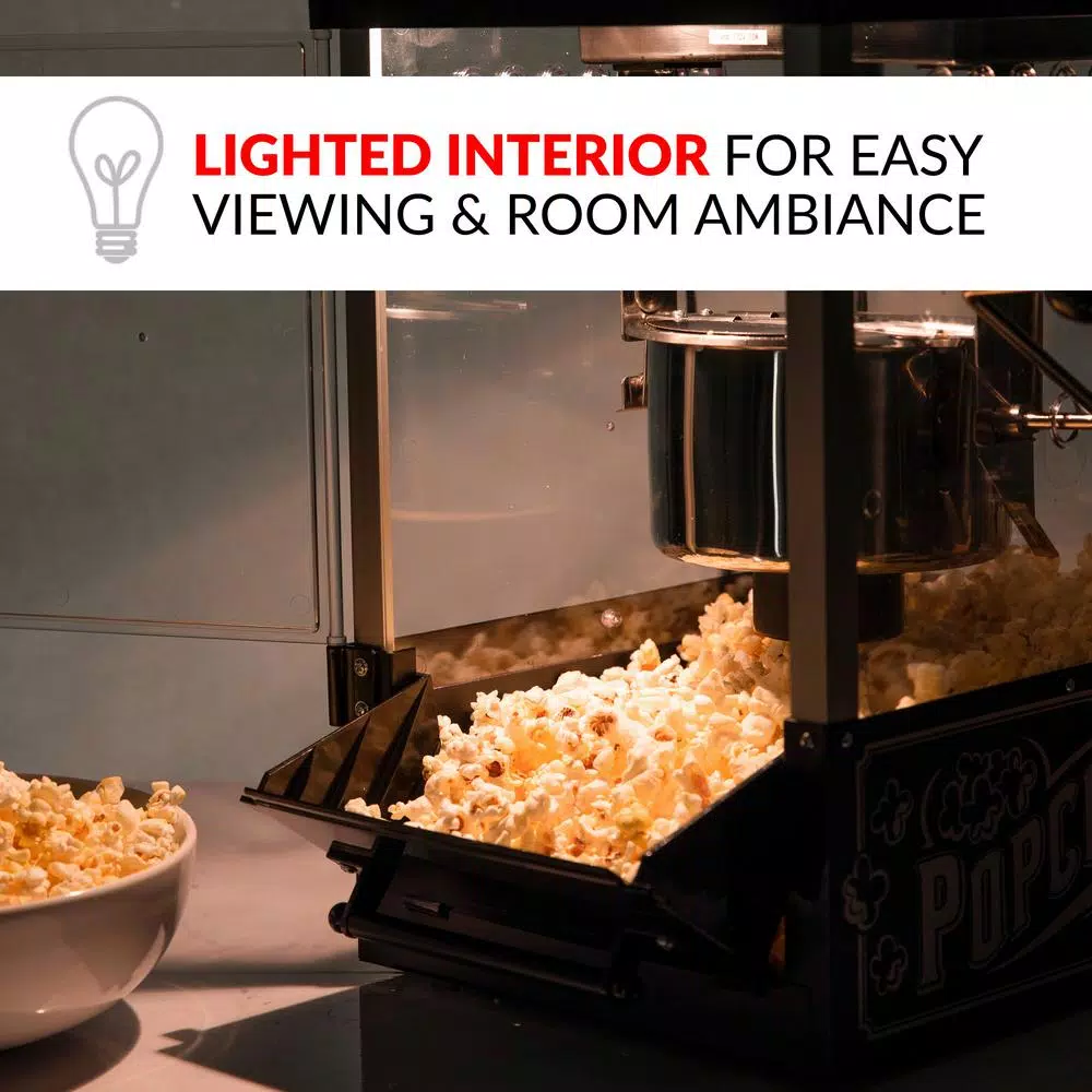 - Lighted interior: lighted interior creates a fun and pleasant room ambiance and allows you to watch your popcorn pop