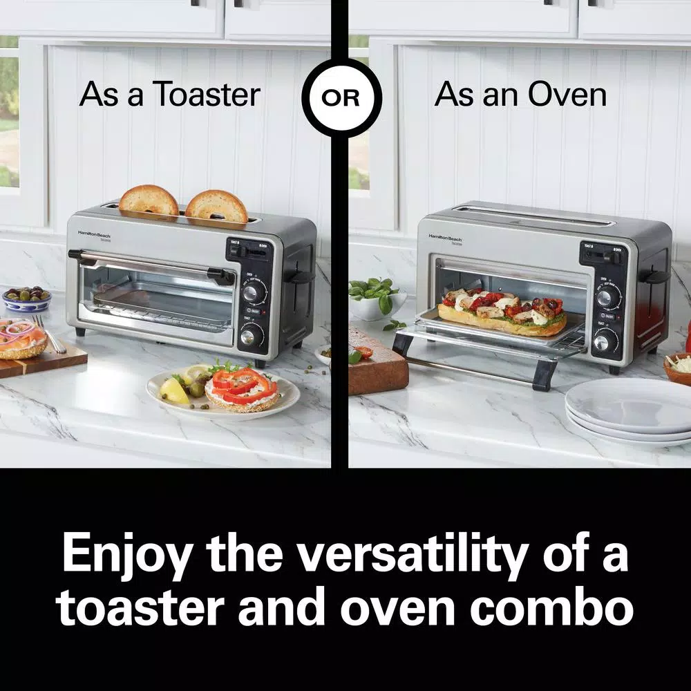 With the simple slide of a lever, the space saving Hamilton Beach Toastation easily switches from 2-slice toaster to compact oven. Even better, it toasts over 50% faster. Don’t be fooled by its compact dimensions or sleek design. The extra-wide bread slot at the top is big enough to fit thick bagels, English muffins, Texas toast or even couple of hot dog buns. You can even select how light or dark you want your toast with the toast shade selector. Below the top toasting slot is an oven that can fit up to 2-slices of pizza or a couple of baked potatoes. Than the leading toaster oven when toasting sliced bread.