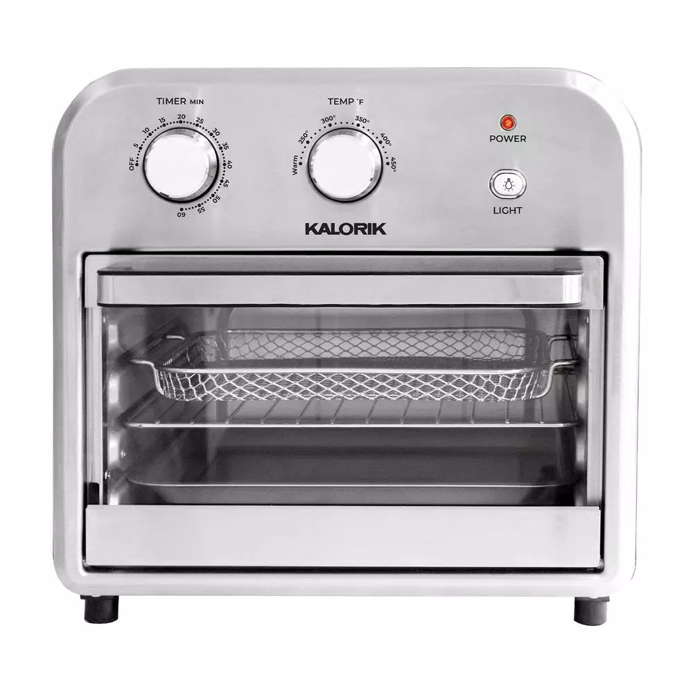 Cook food faster than ever while reducing fat and calories with the KALORIK 12.qt. Air Fryer Oven. Using advanced Rapid Hot Air Technology, this high-performance air fryer oven cooks food up to 30% faster – with no preheating required. Fry all your favorite foods to crunchy, golden perfection with little to no oil, reducing fat by up to 75%. The KALORIK Air Fryer Oven achieves a delightfully-crispy exterior and moist, tender interior, so you can indulge without the guilt. Adjustable time and temperature dials customize cooking for each dish. The appliance reaches up to 450°F, so you can even broil and toast your food. The inner oven light and glass door allow you to easily monitor your food while it cooks, while the included air frying basket, baking pan, air rack and crumb tray offer great versatility in menu options.