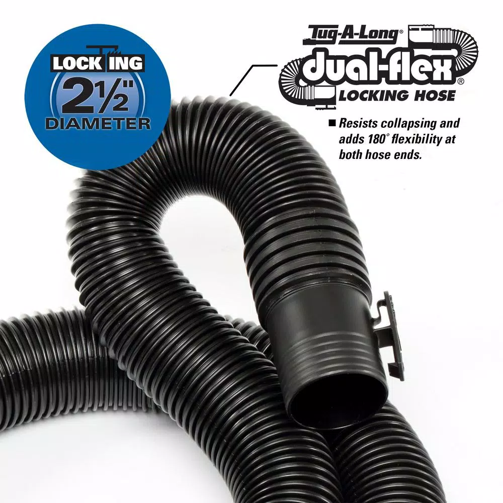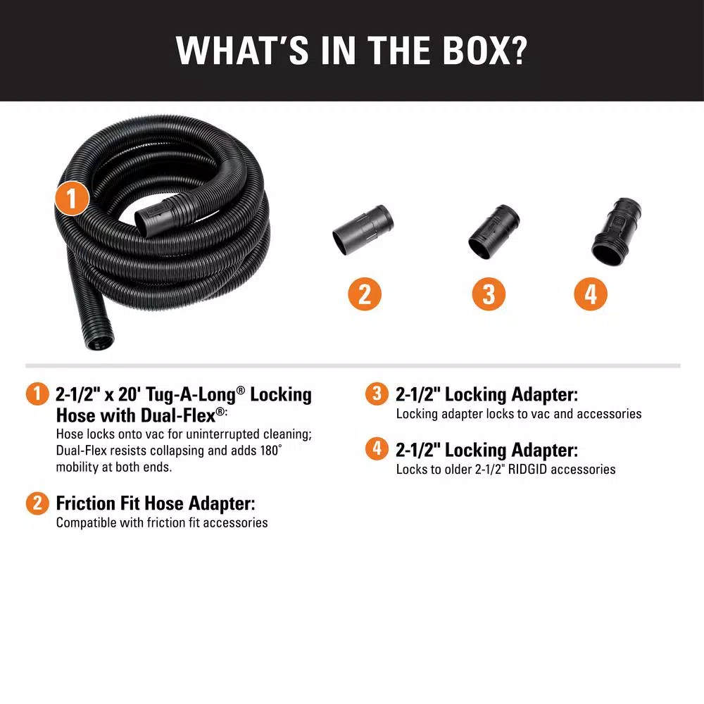 RIDGID’s 2-1/2 in. Dual-Flex Tug-A-Long locking hose extends up to 20 ft. for more reach and flexibility than a standard wet/dry vac hose. With the new locking design, your hose locks onto both your vac and your wand or accessory, so nothing falls during use. It fits all RIDGID 2-1/2 in. inlet configurations and includes 3 adapters for compatibility. The hose’s Dual-Flex feature adds 180° mobility at each end and its flexible design resists clogging. Easily detach by releasing the locking tab or twisting off. The 2-1/2 in. opening is the optimal size for tackling large messes with a RIDGID wet dry vac. Maximum your vac and get the most out of your cleaning tools with RIDGID’s 2-1/2 in. locking accessories.